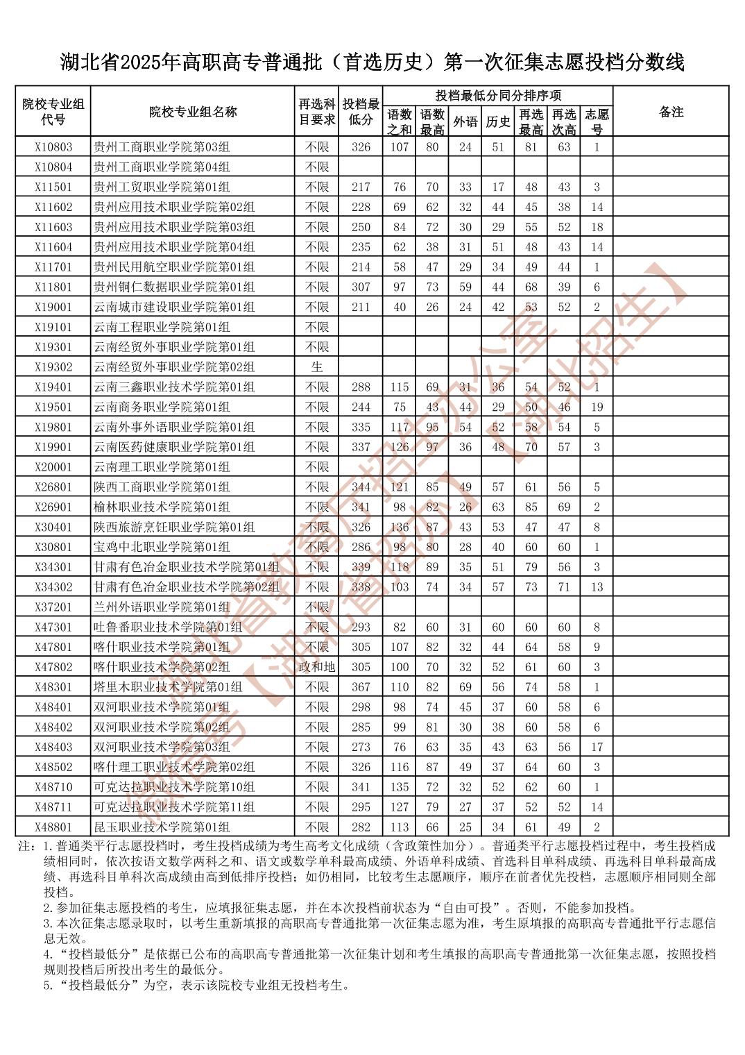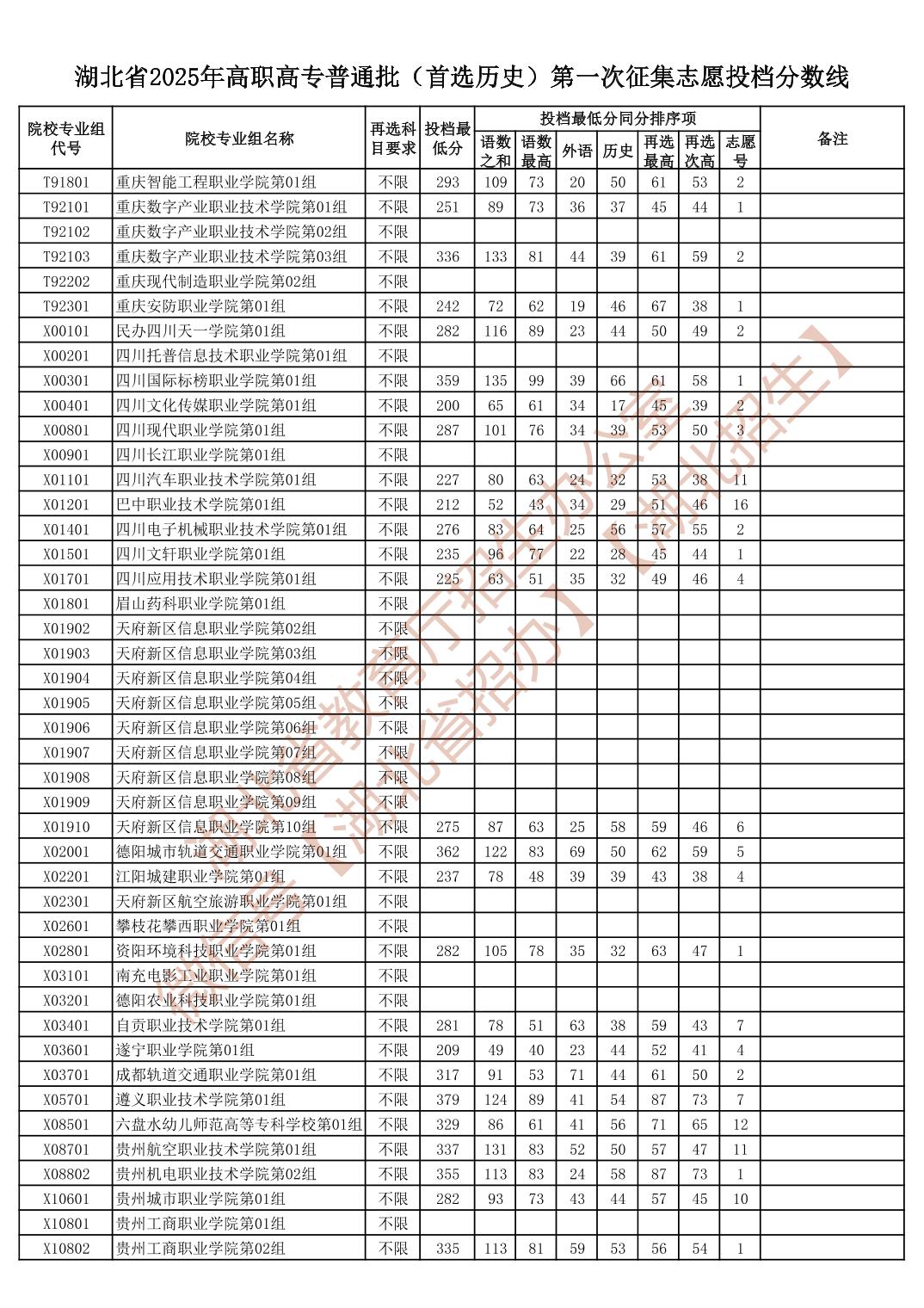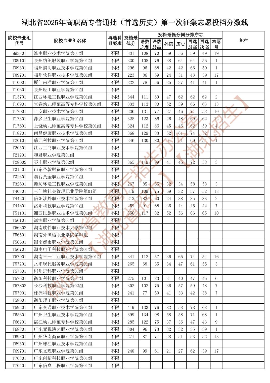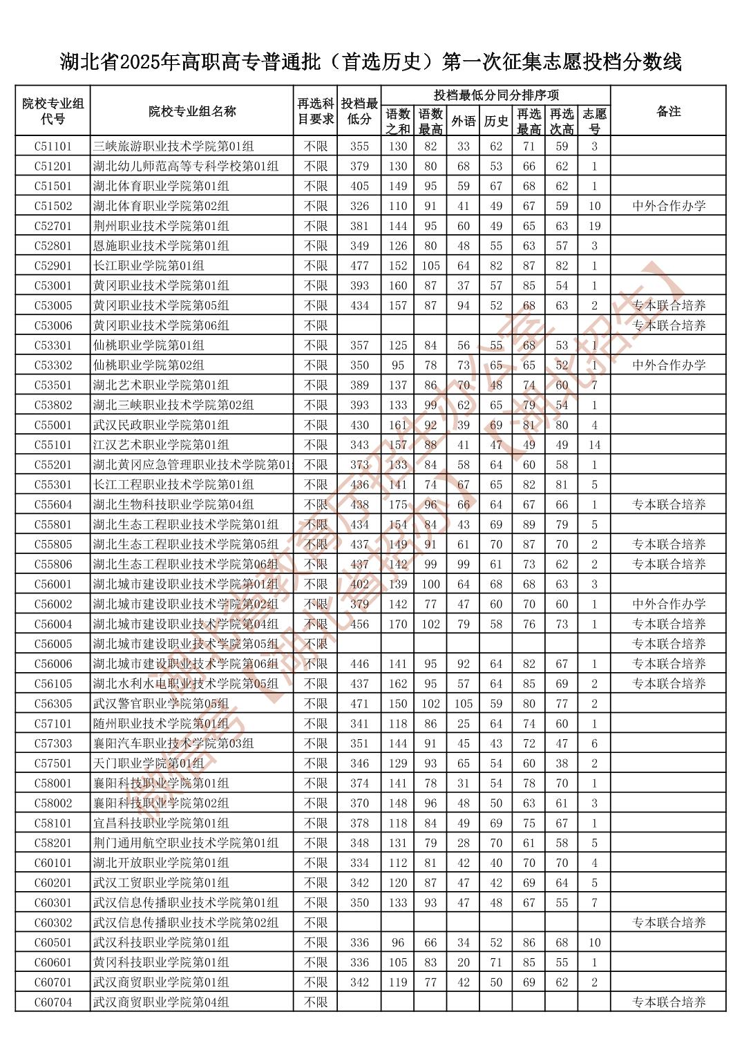 湖北省2025年高职高专普通批(首选历史)第一次征集志愿投档分数线已发布,具体内容如下: