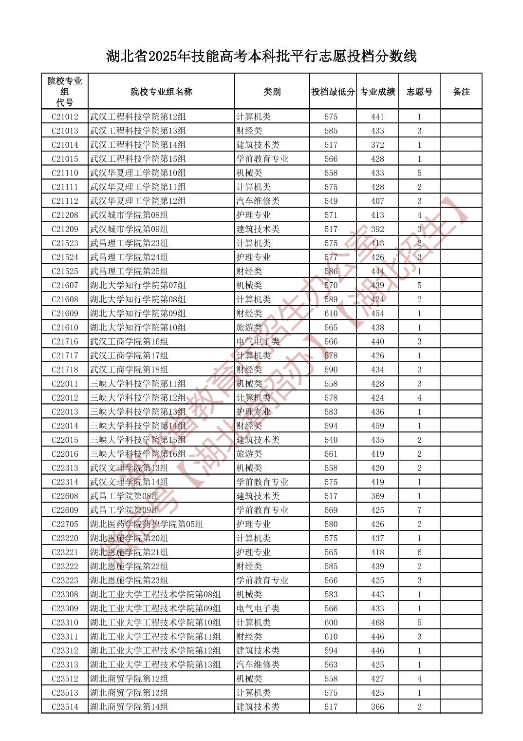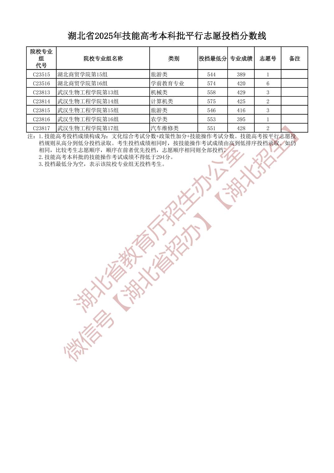 湖北省2025年技能高考本科批平行志愿投档分数线