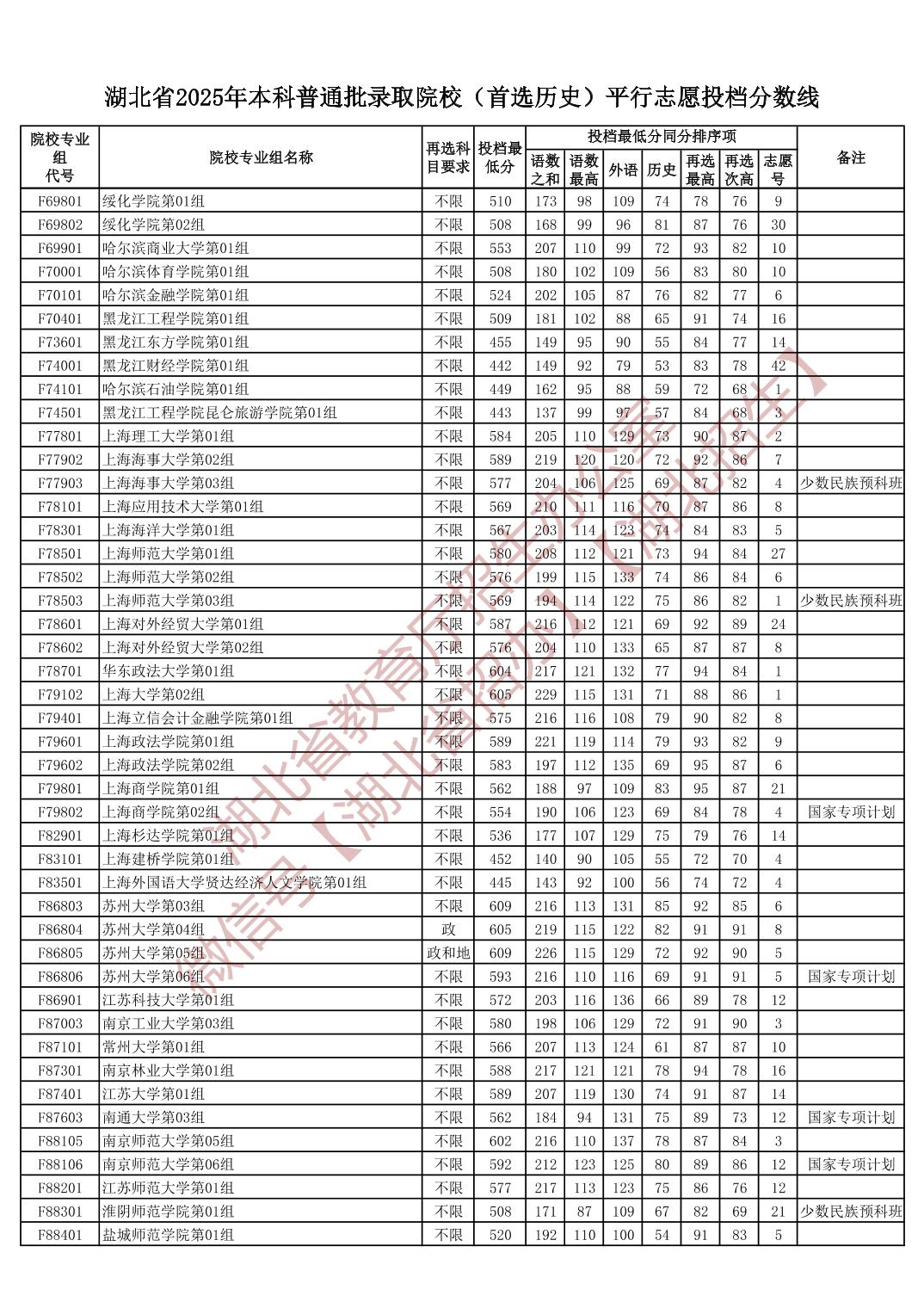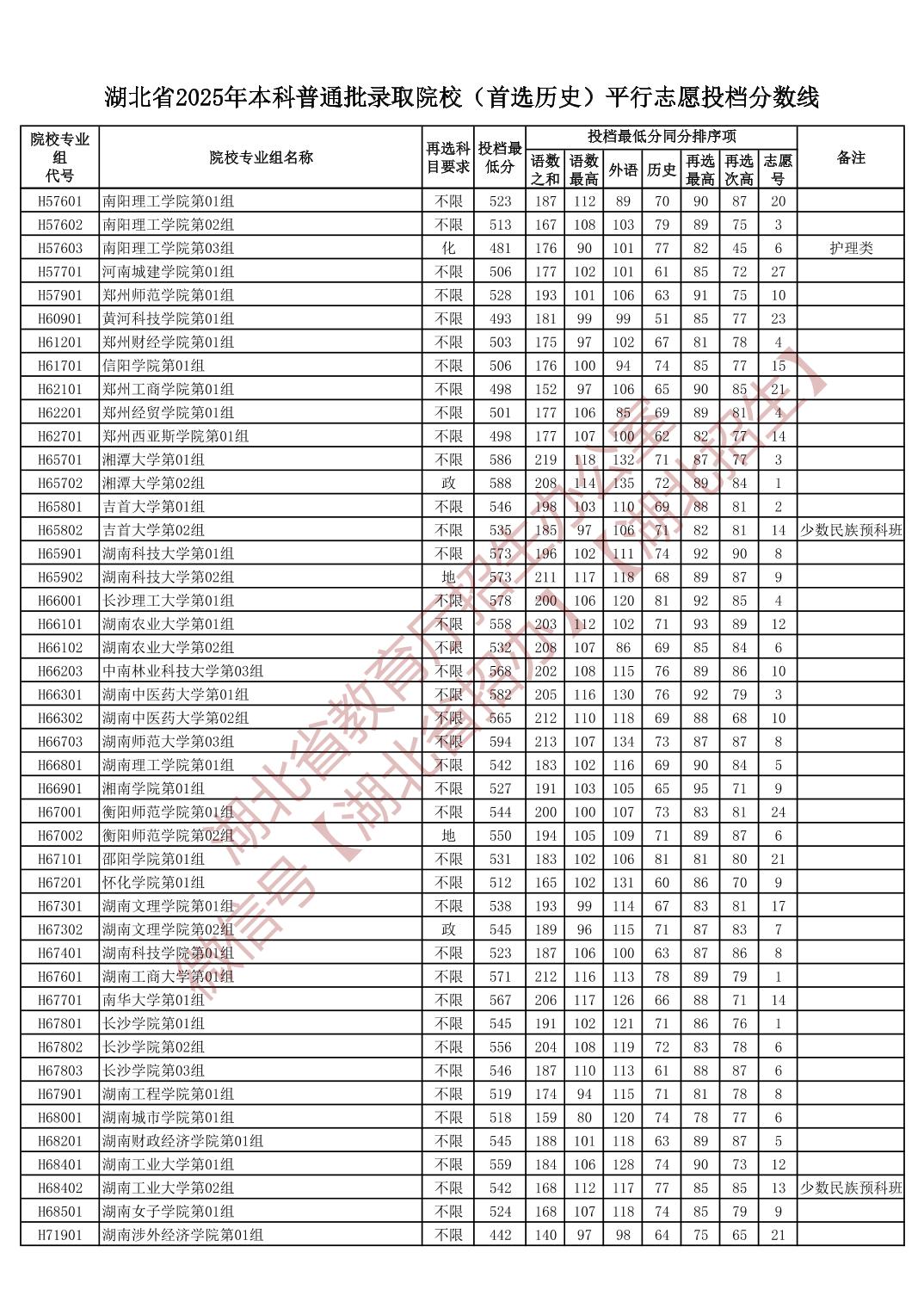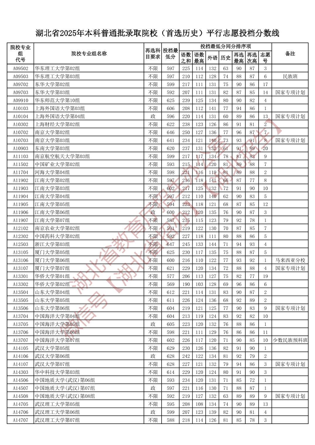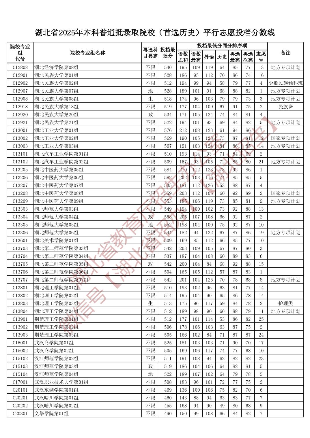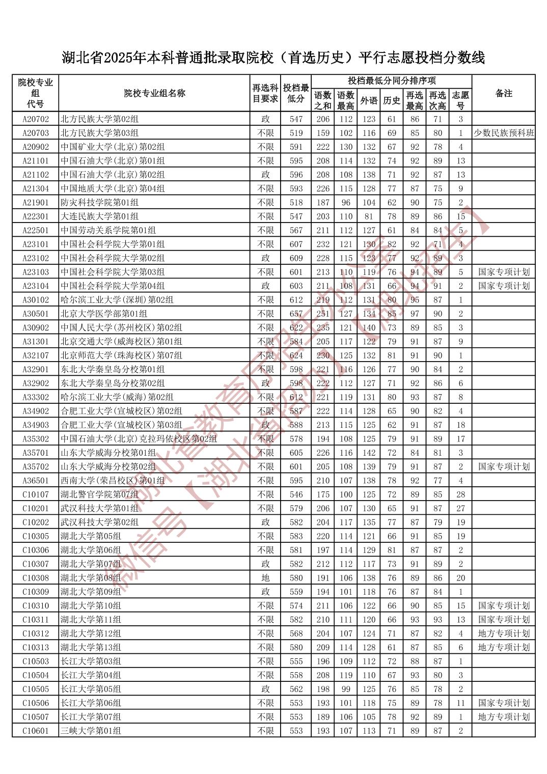 湖北省2025年本科普通批录取院校(首选历史)平行志愿投档分数线