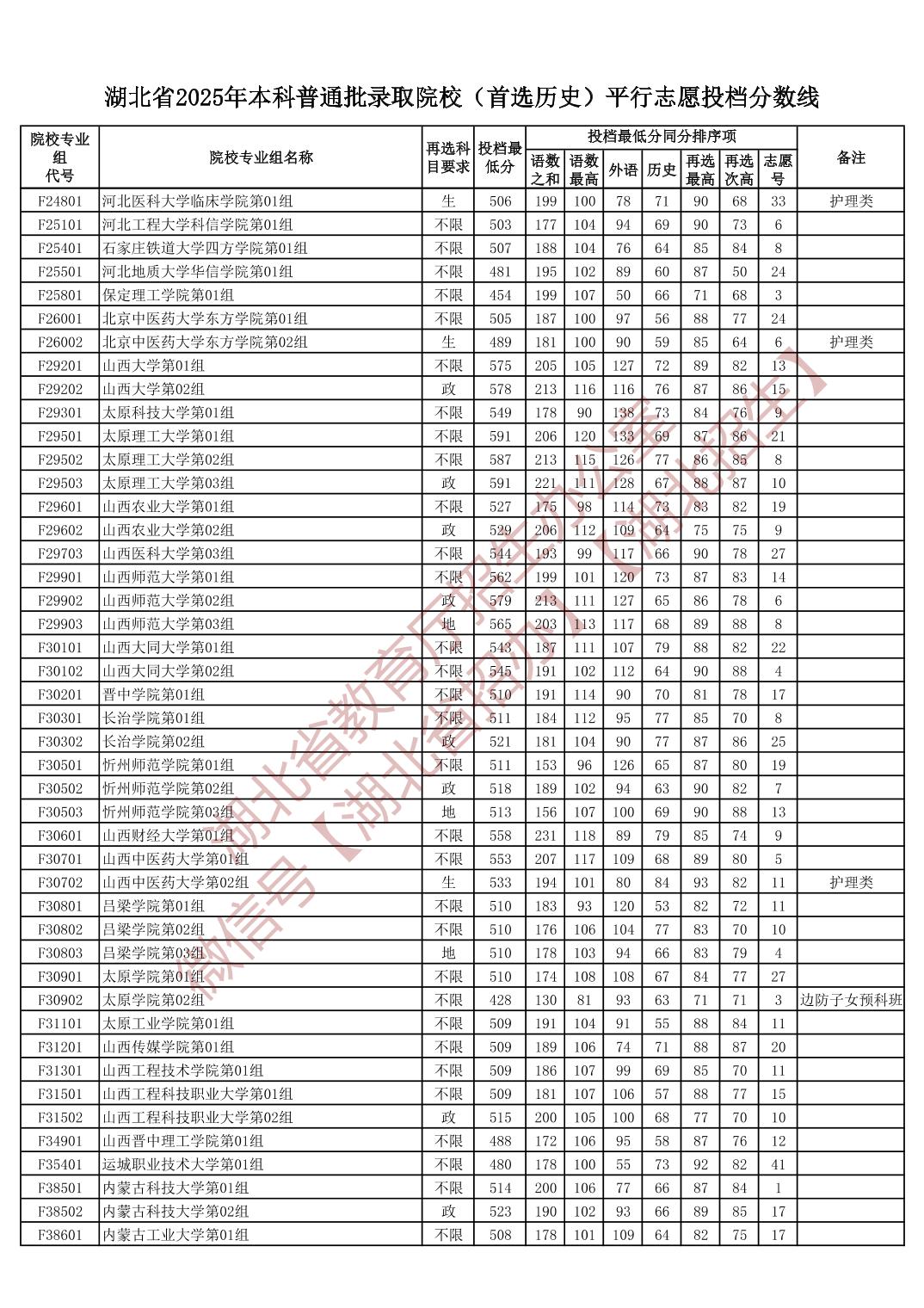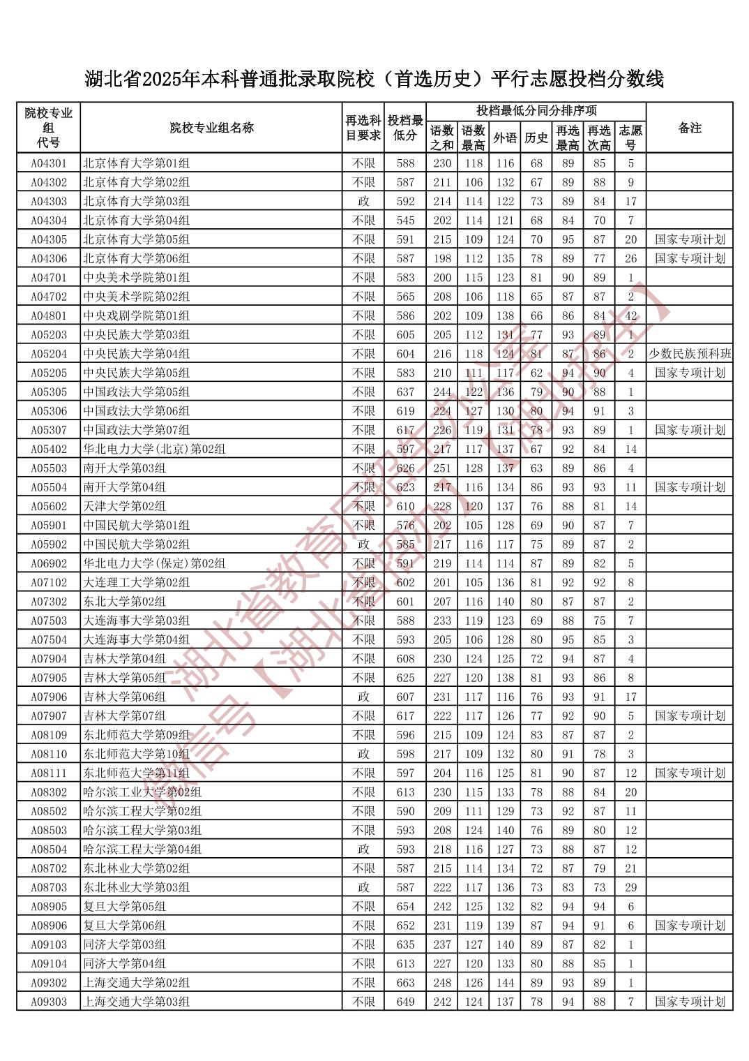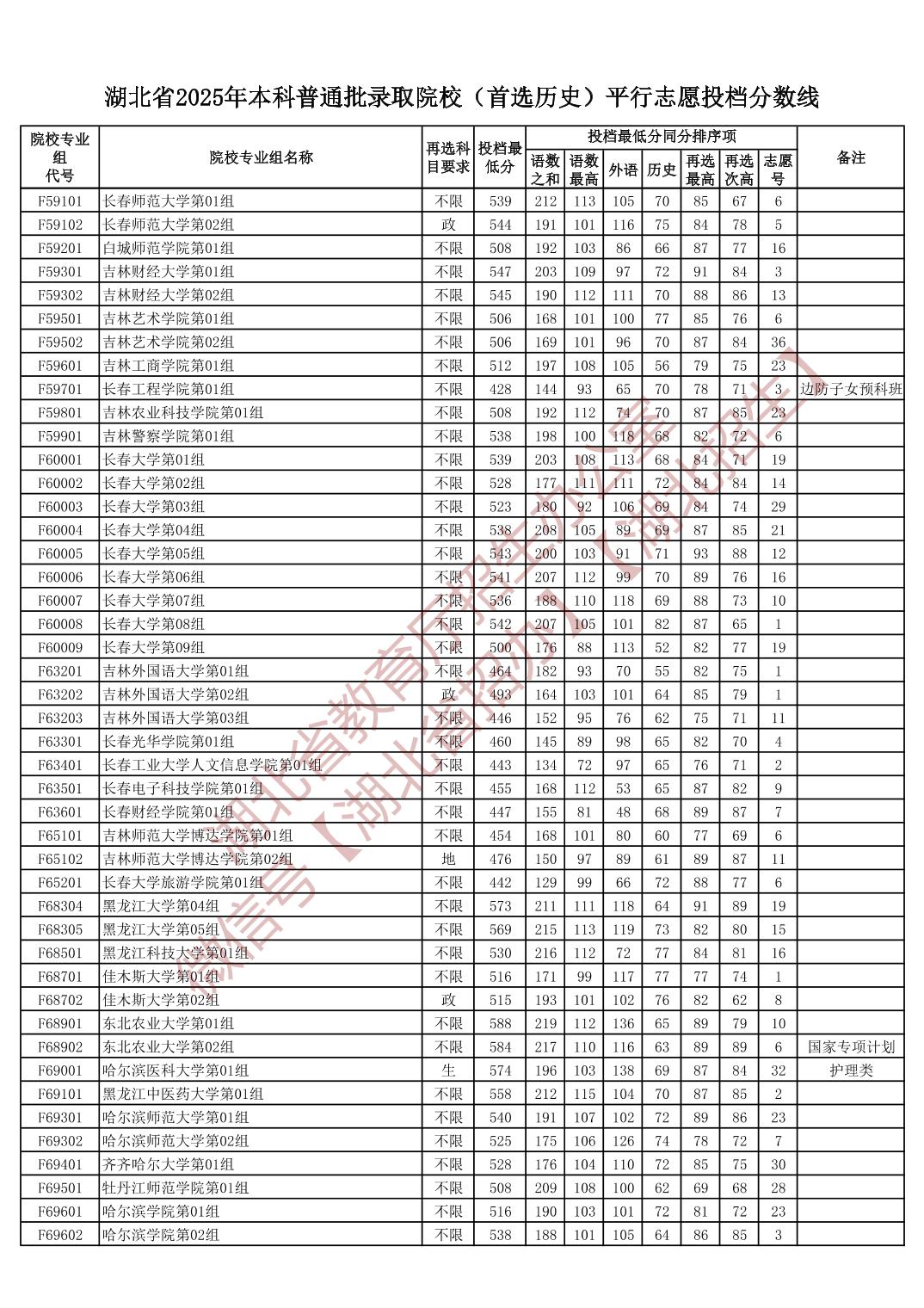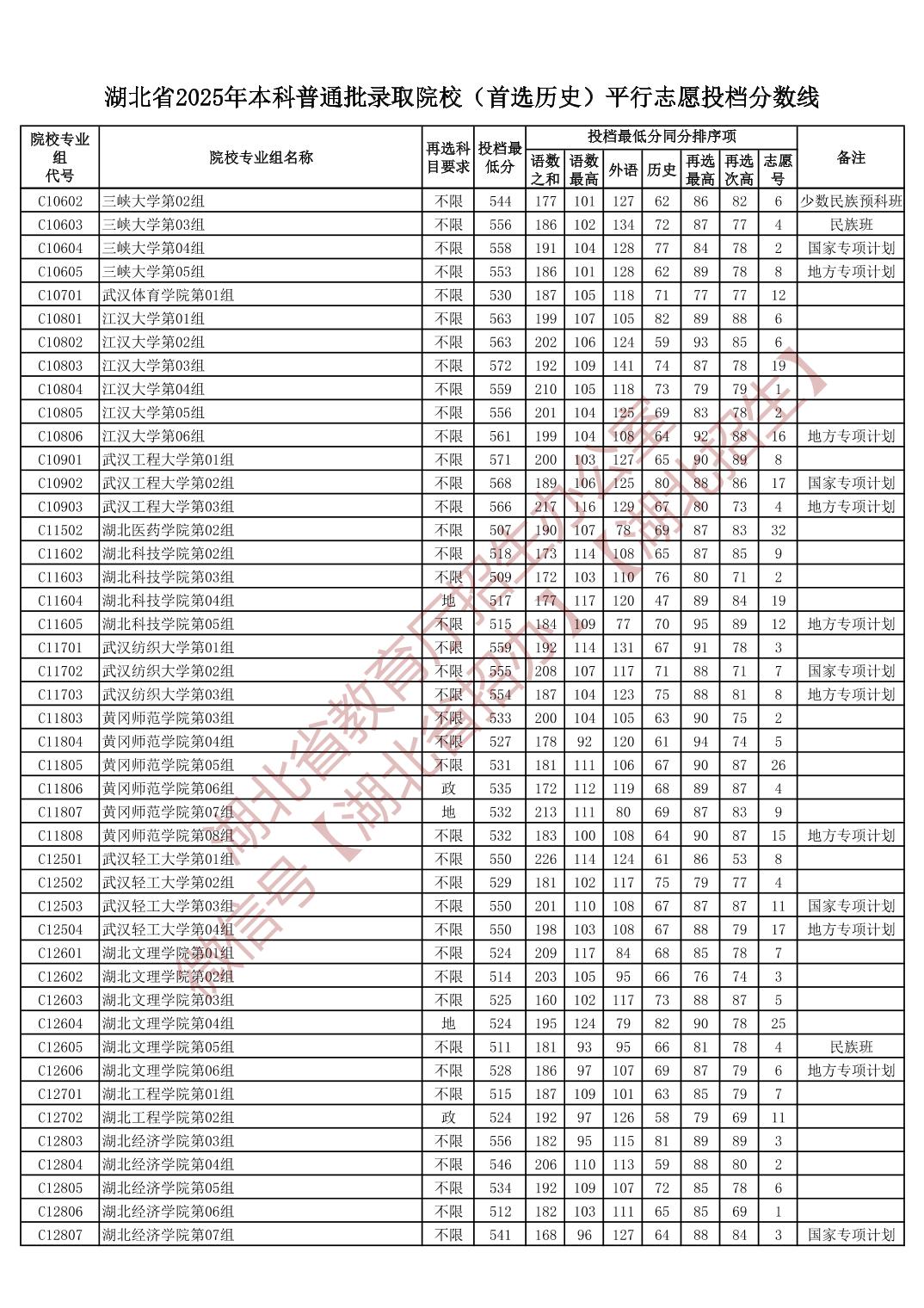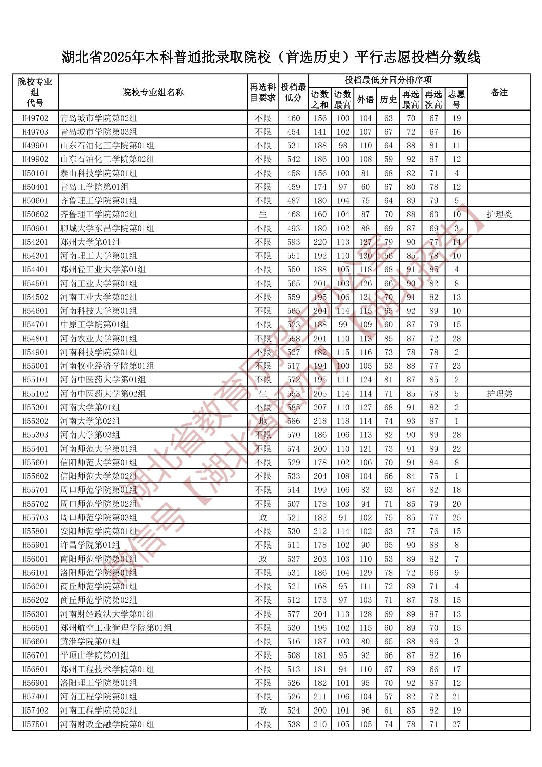 湖北省2025年本科普通批录取院校(首选历史)平行志愿投档分数线