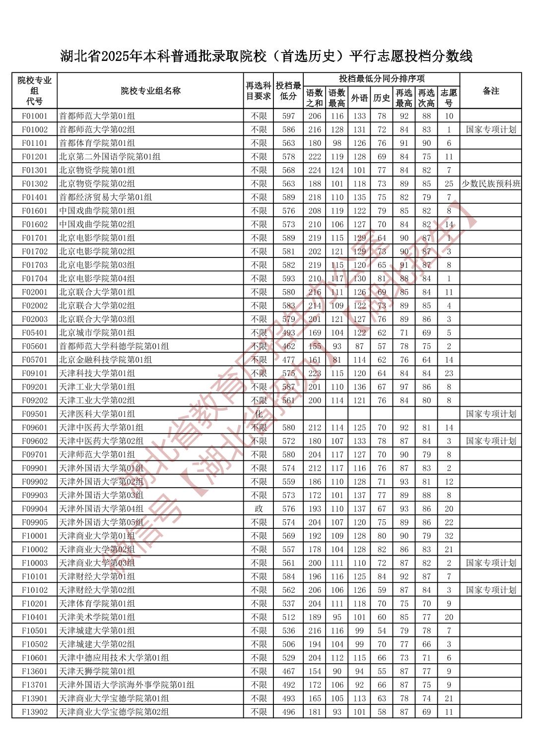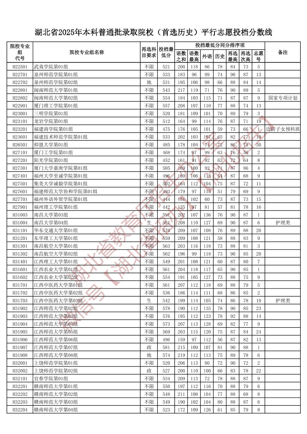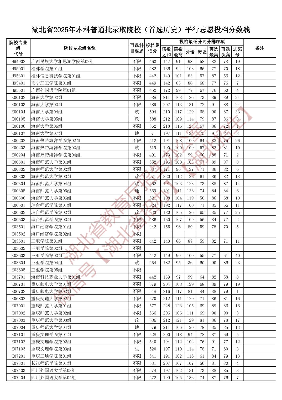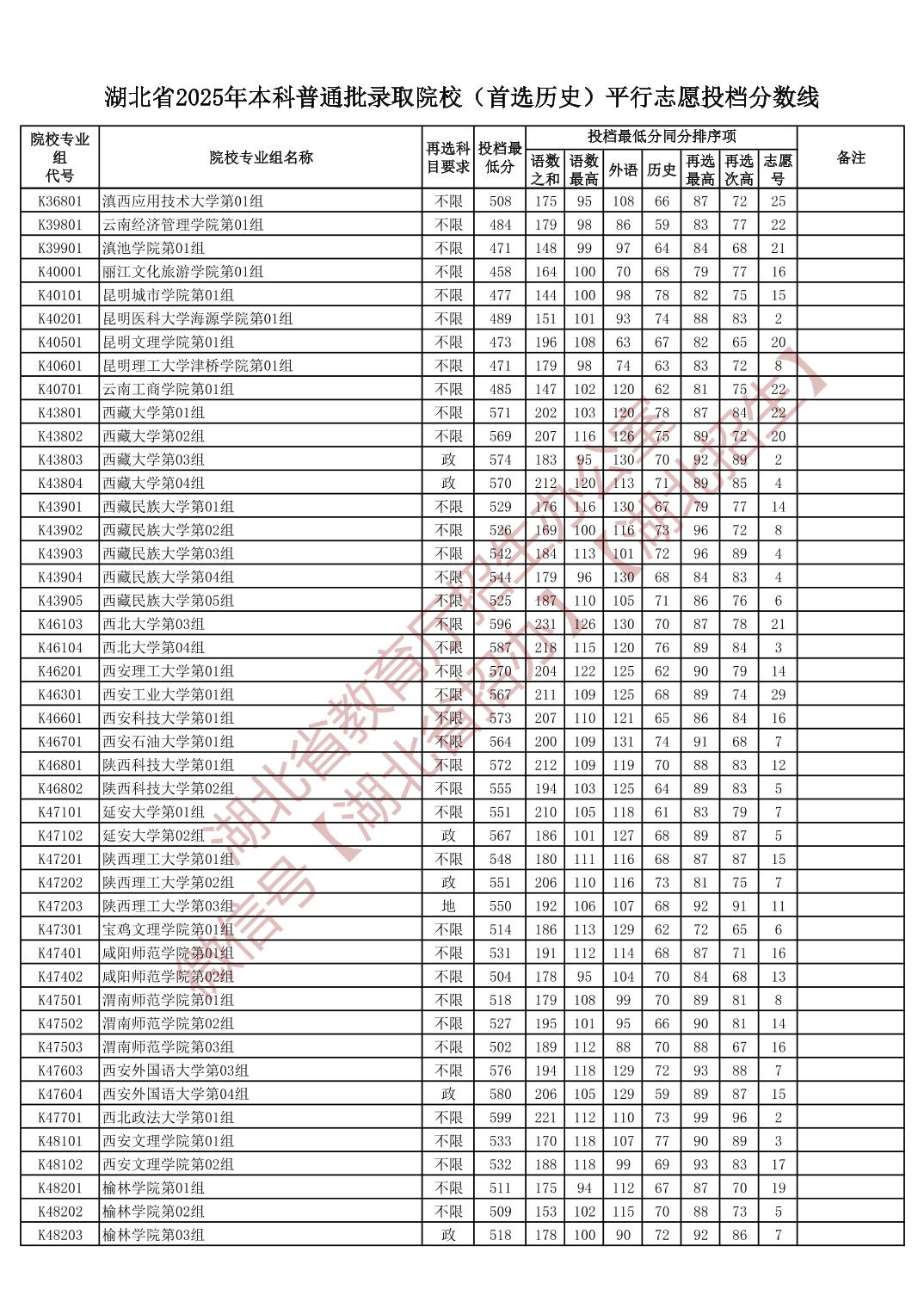 湖北省2025年本科普通批录取院校(首选历史)平行志愿投档分数线