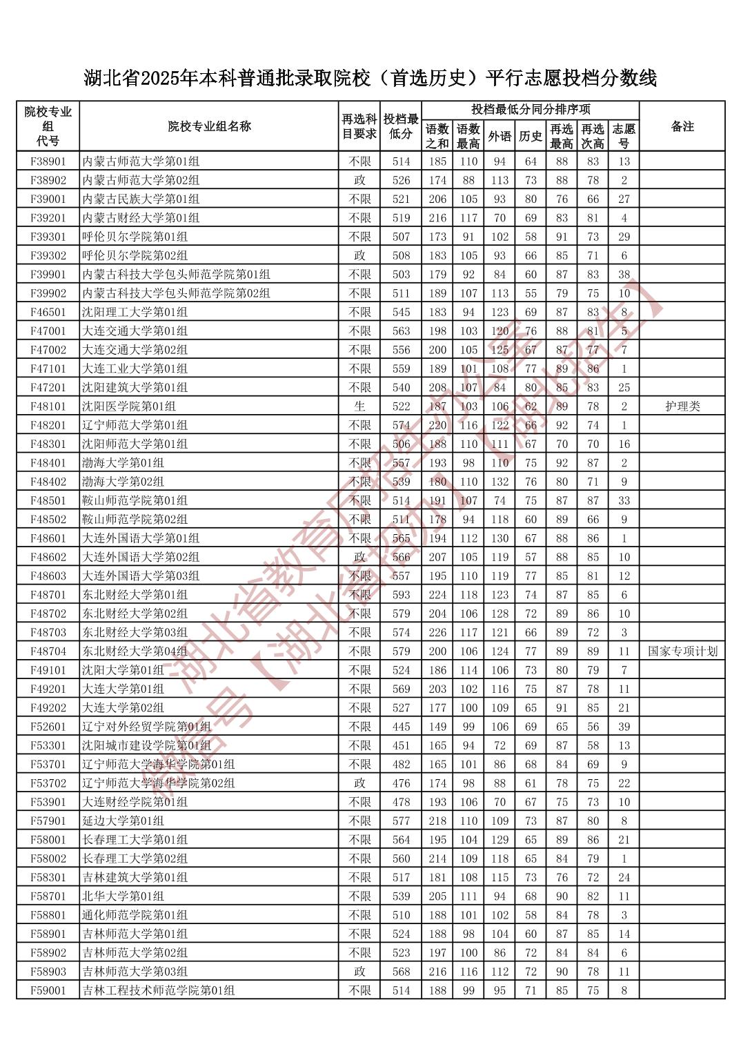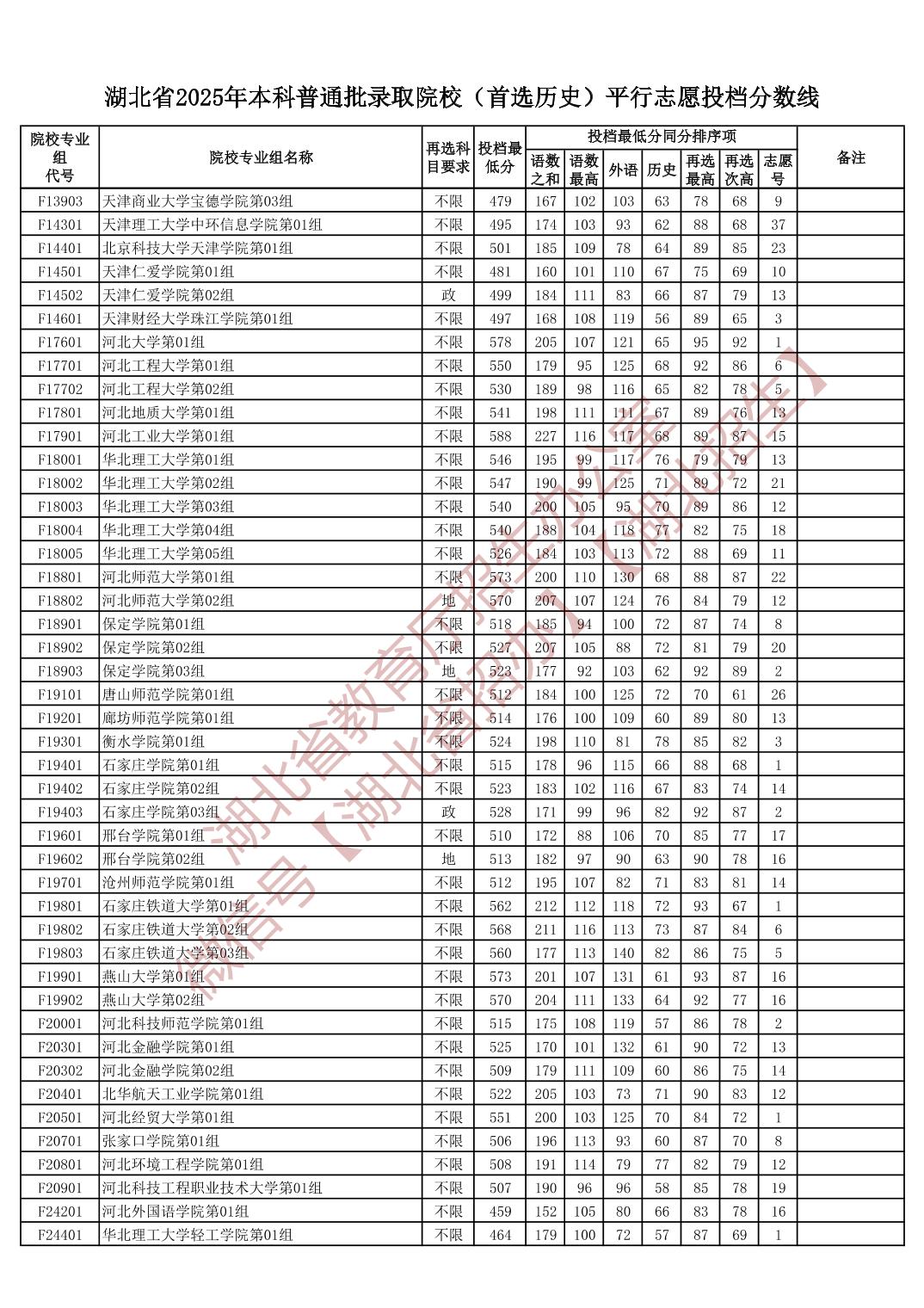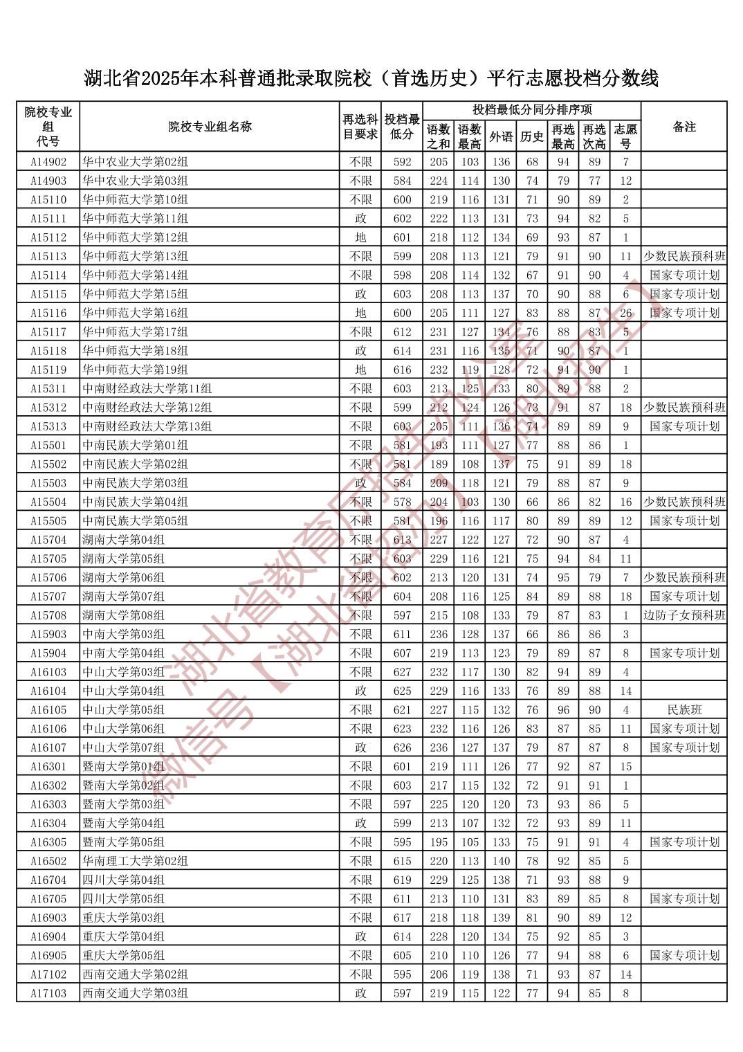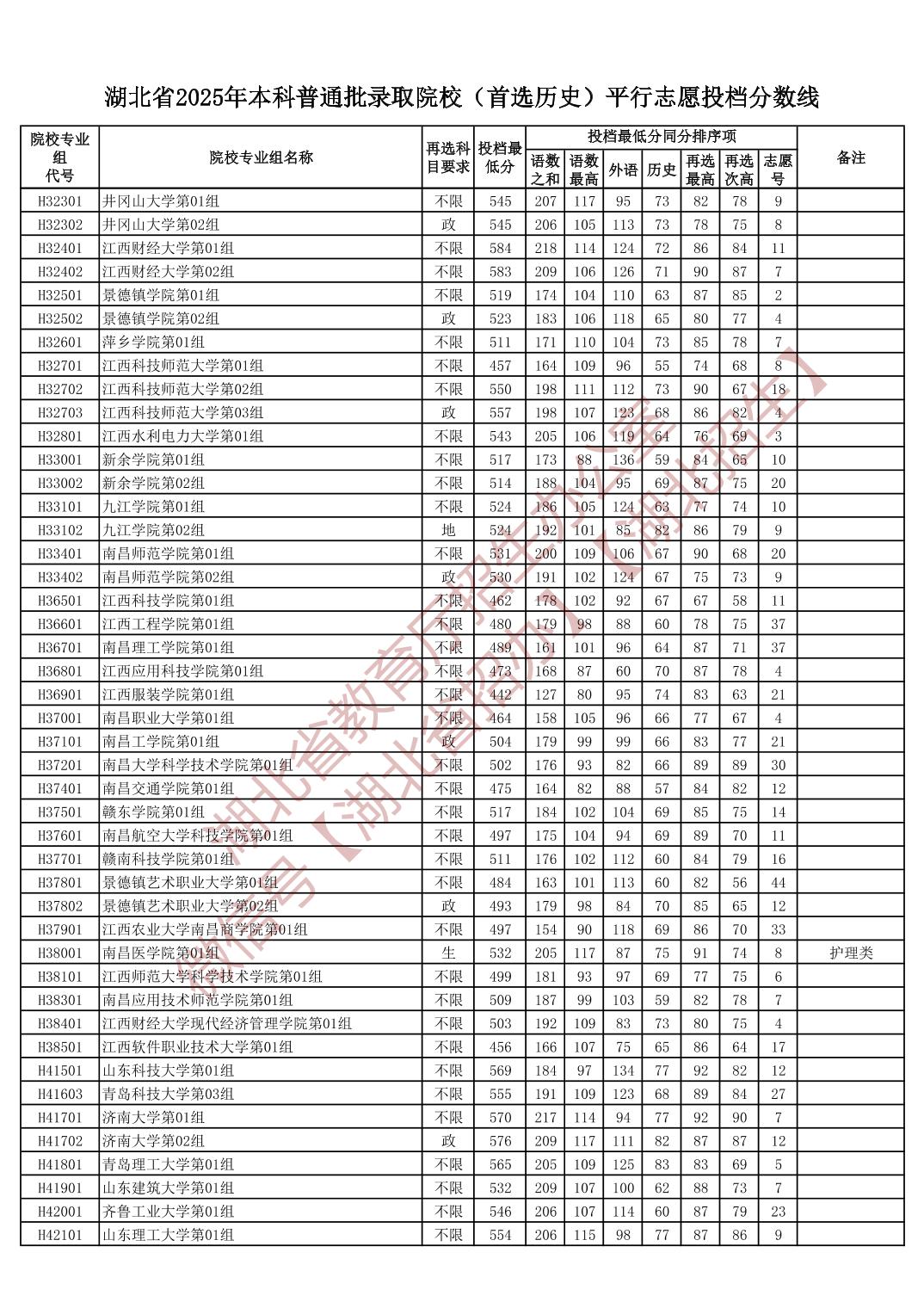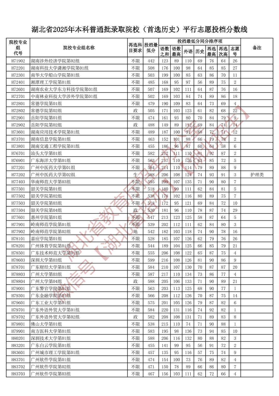 湖北省2025年本科普通批录取院校(首选历史)平行志愿投档分数线