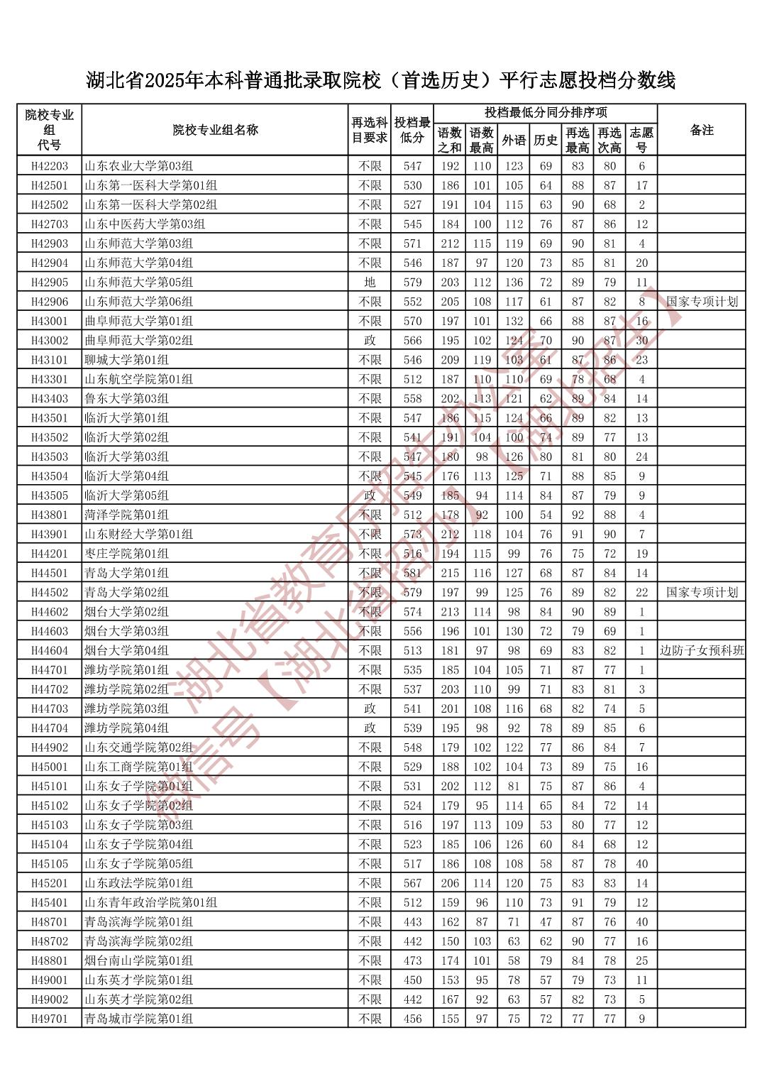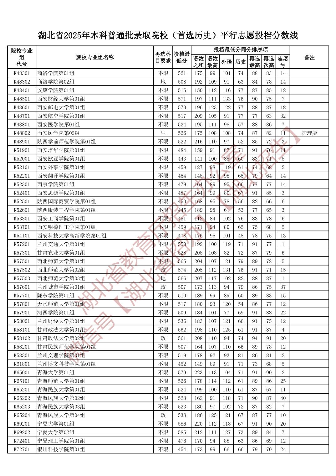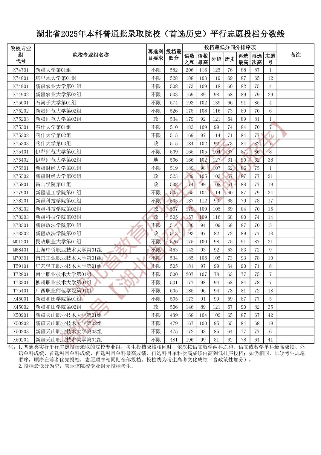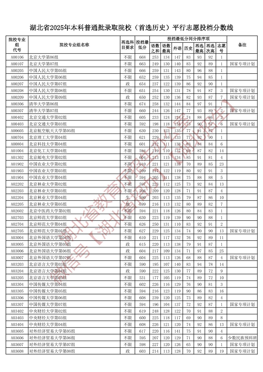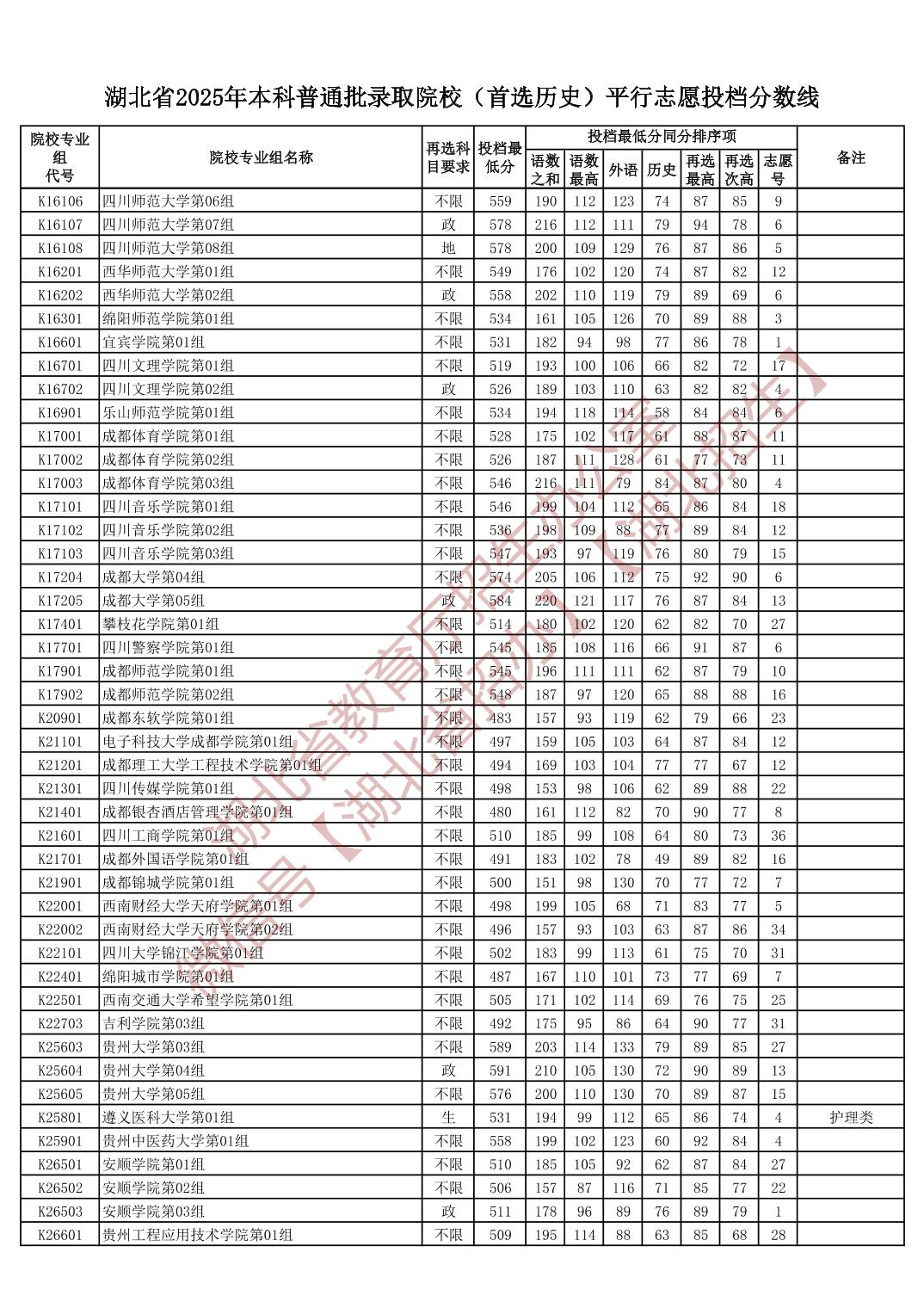 湖北省2025年本科普通批录取院校(首选历史)平行志愿投档分数线