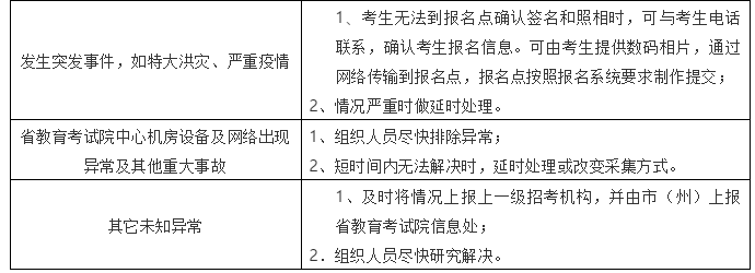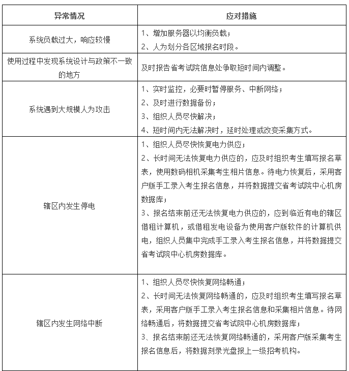 系统在运行过程中,一旦发生以下各类情况及其他不可预知的情况,各市(州)要及时报告我院信息处,由省教育考试院启动相应处理措施,各市(州)、县(市、区)和所属报名点须快速予以响应和执行。