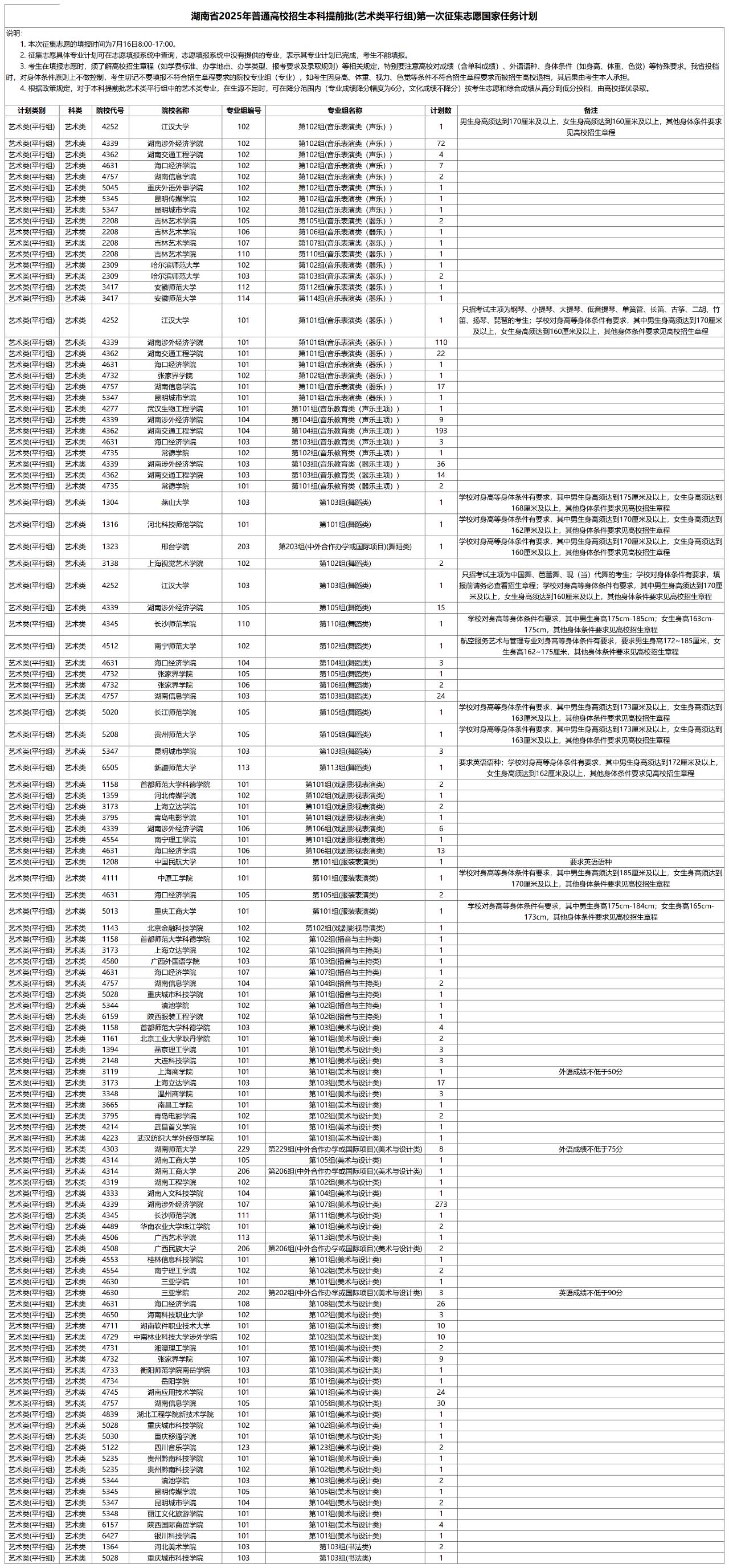 湖南省2025年普通高校招生本科提前批(艺术类平行组)第一次征集志愿国家任务计划已发布,具体内容如下: