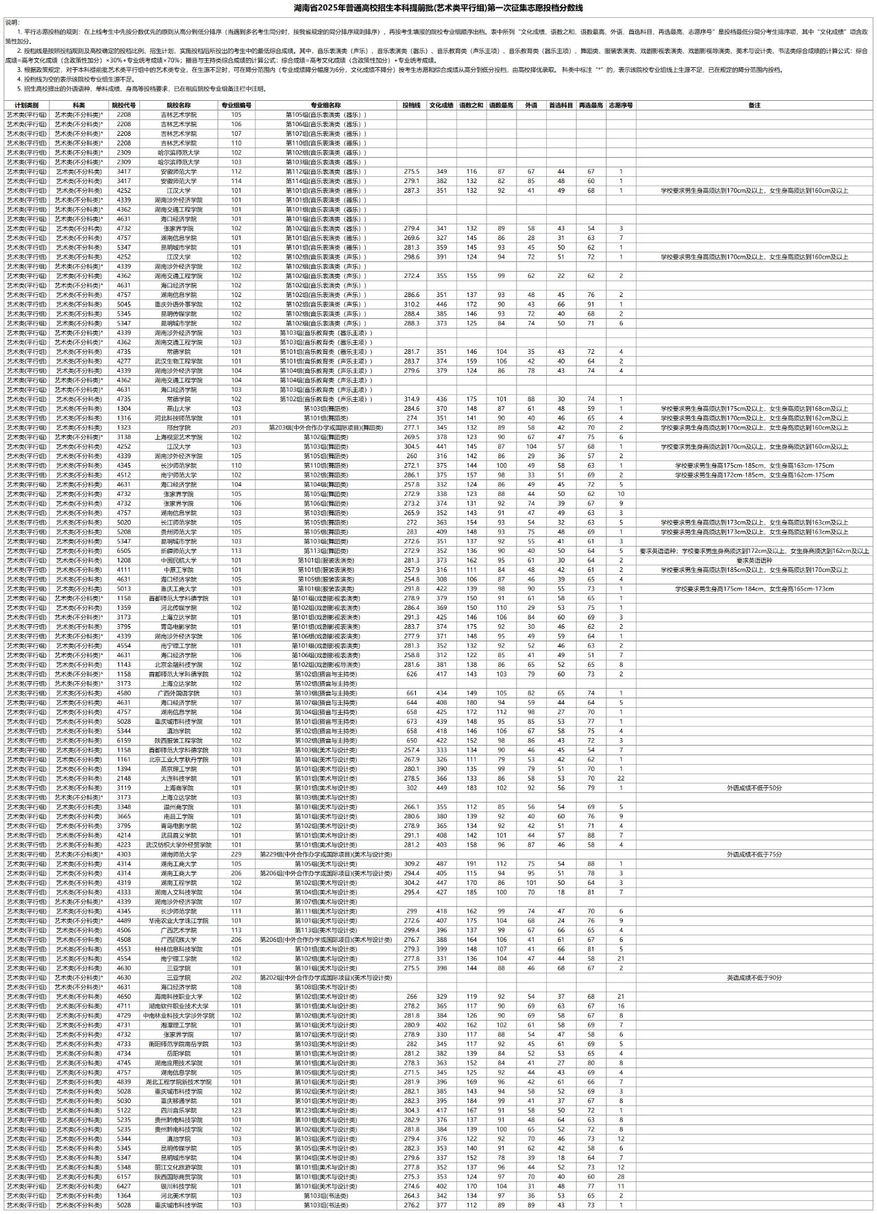 湖南省2025年普通高校招生本科提前批(艺术类平行组)第一次征集志愿投档分数线已发布,具体内容如下: