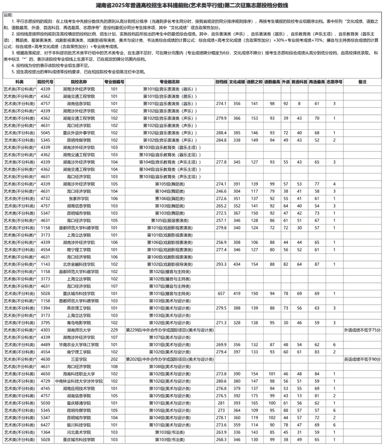 湖南省2025年普通高校招生本科提前批(艺术类平行组)第二次征集志愿投档分数线