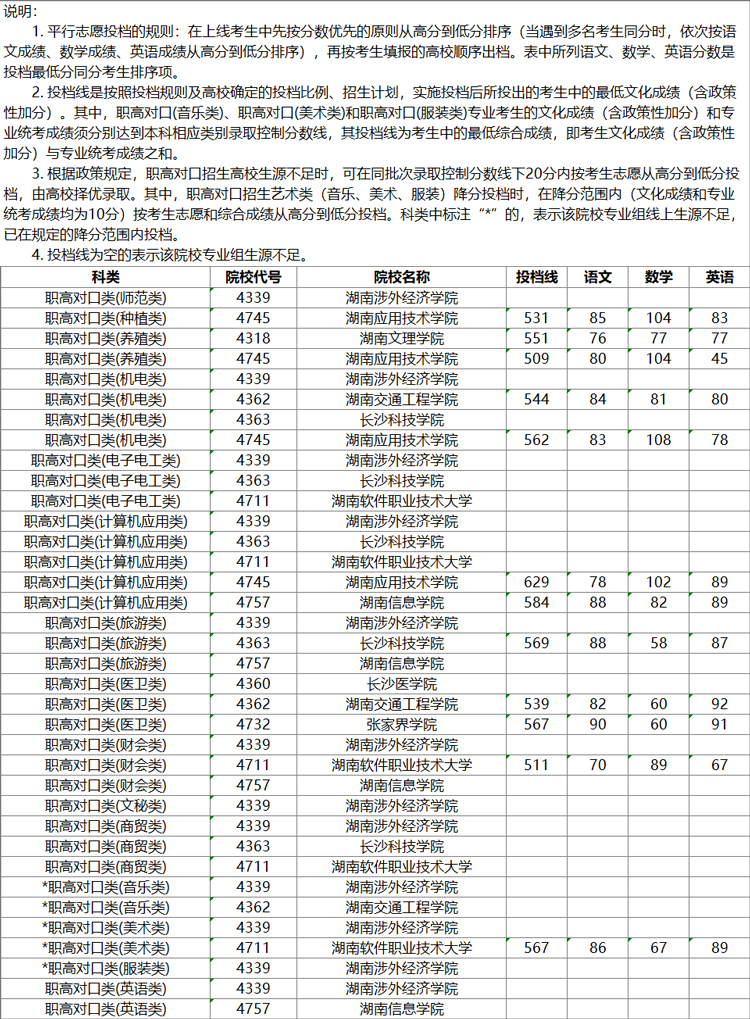 2025湖南高考本科批第二次征集志愿投档分数线(普通类不组织专业考试的艺术专业、体育类、职高对口类)