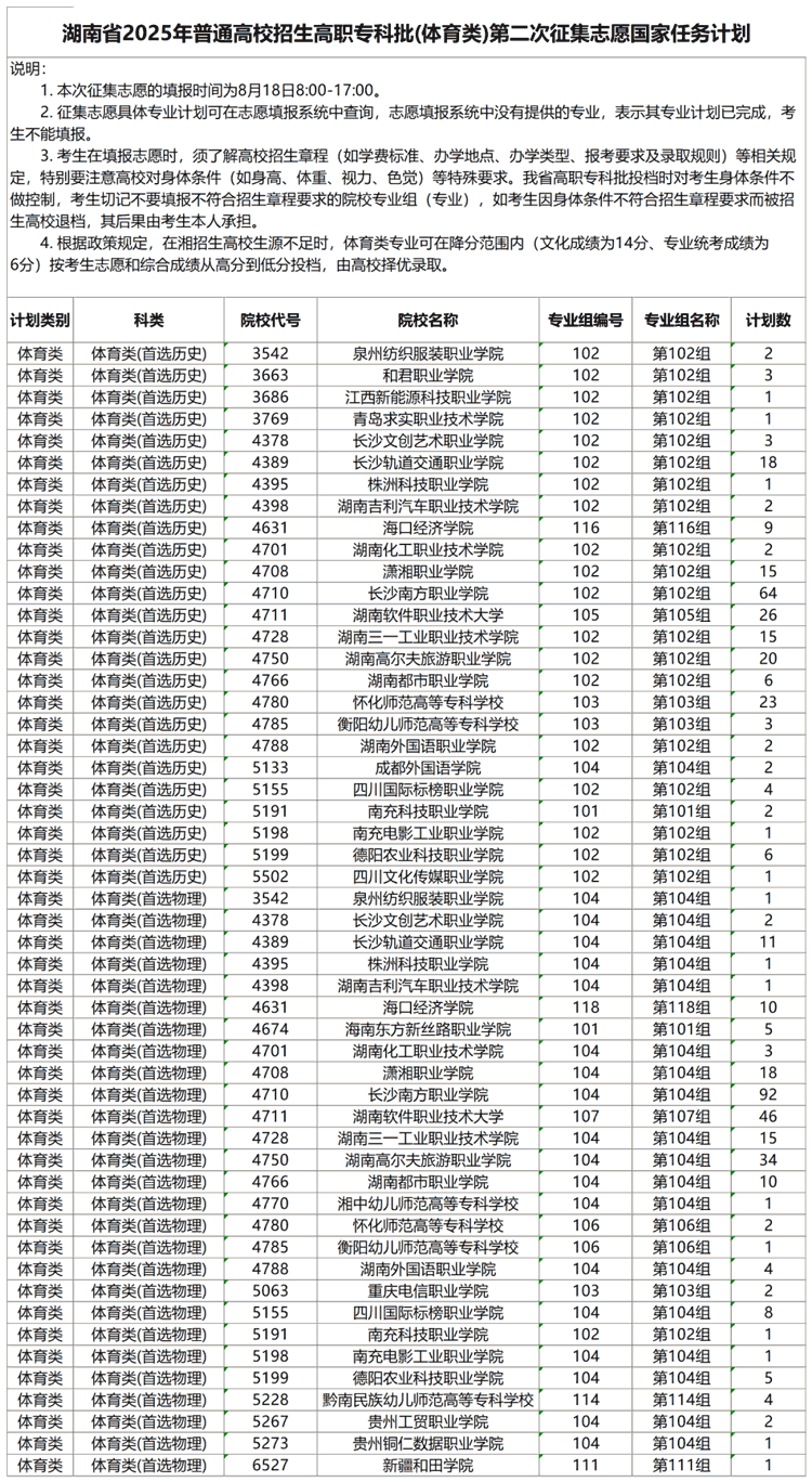 湖南省2025年普通高校招生高职专科批(体育类)第二次征集志愿国家任务计划已发布,具体内容如下: