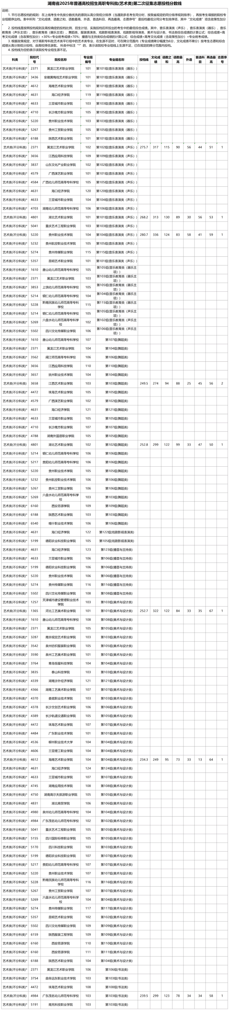 湖南省2025年普通高校招生高职专科批(艺术类)第二次征集志愿投档分数线已发布,具体内容如下: