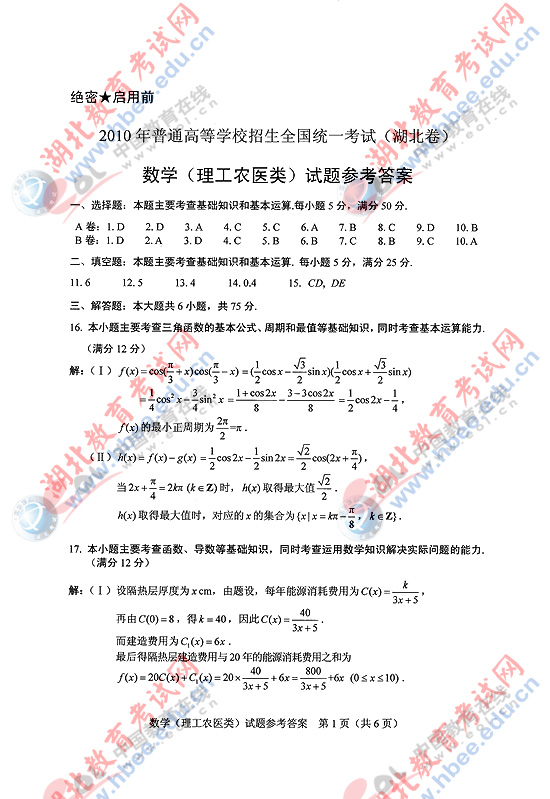 2010湖北省高考试题发布:数学试卷(理工农医类)