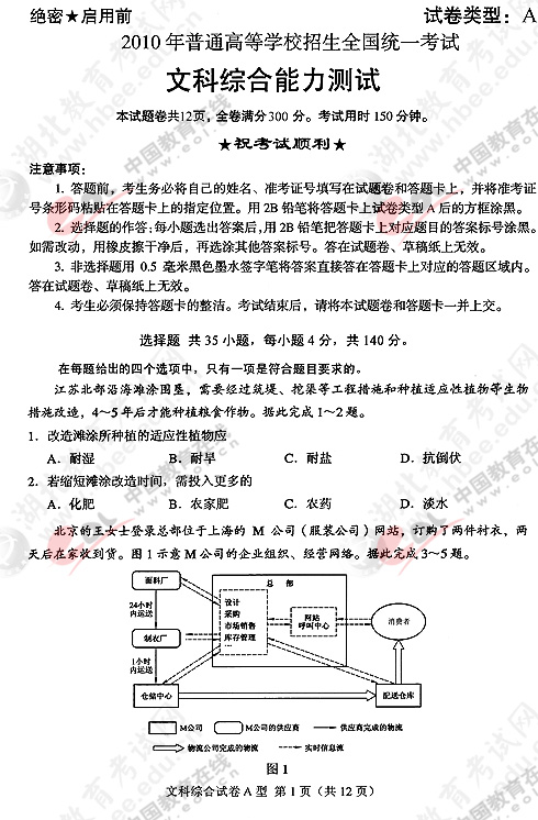 2010年湖北省高考试题发布:文科综合试卷(A)及答案
