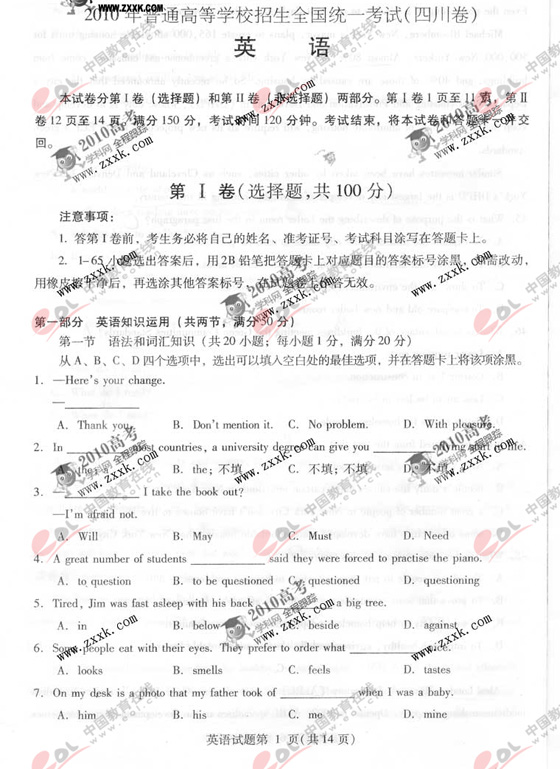 2010年四川省高考试题发布:英语试卷