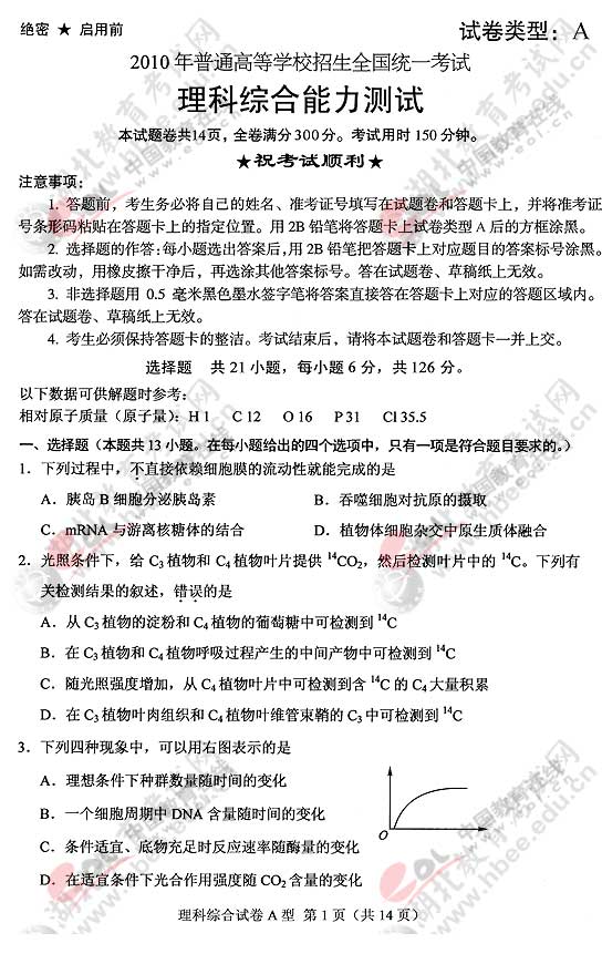 2010年湖北省高考试题发布:理科综合A卷及答案