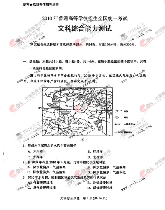 2010年湖南省高考试题发布:文科综合试卷及答案