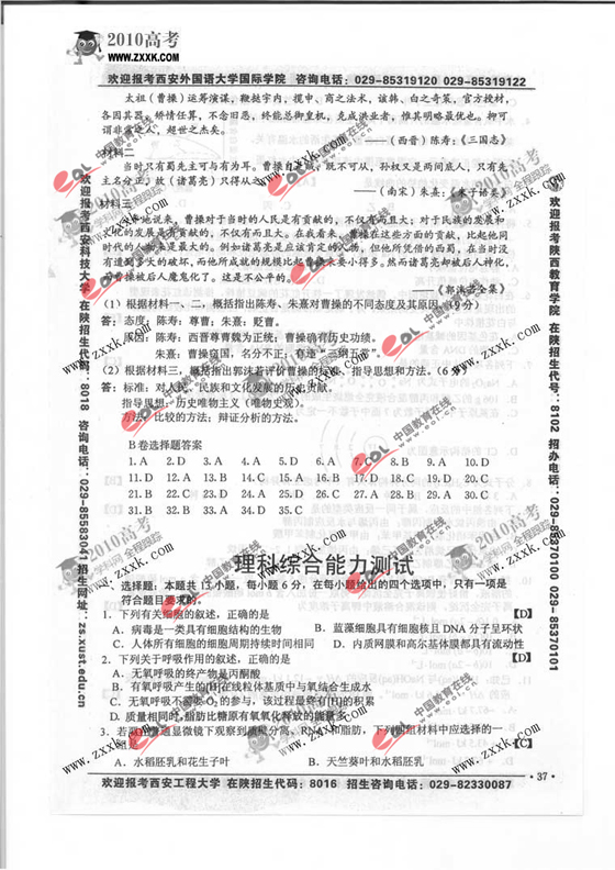 2010年陕西省高考试题发布:理科综合试卷及答案
