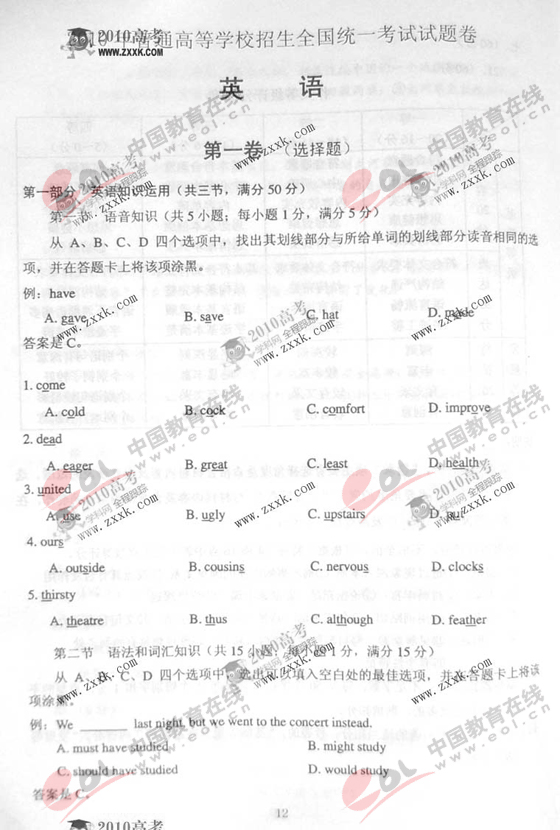2010年高考试题发布:大纲全国II英语试卷及答案