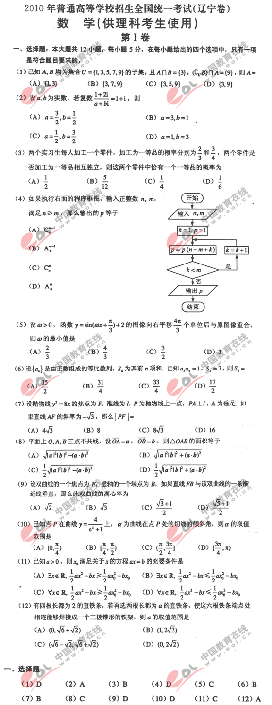 2010年辽宁省高考试题发布:理数试卷及答案