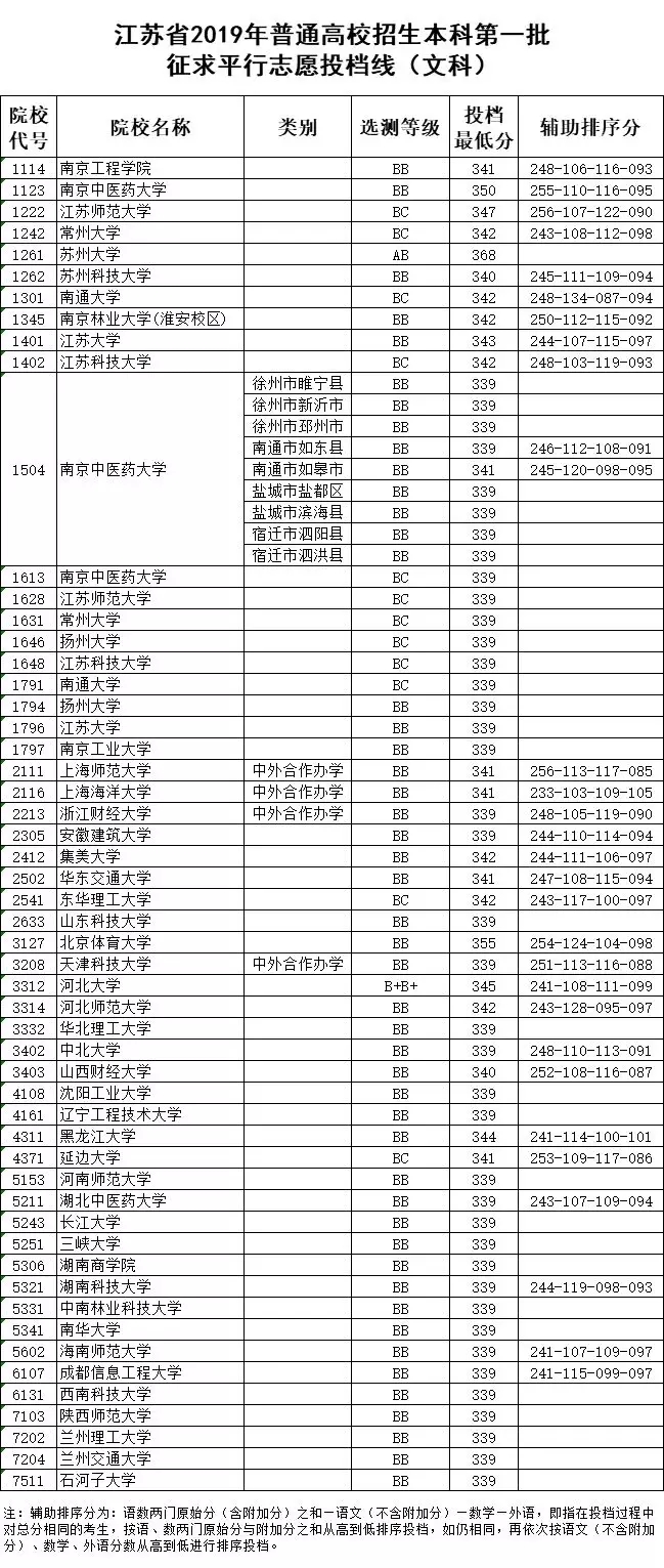 江苏省2019年普通高校招生本科第一批征求平行志愿投档线(文科)