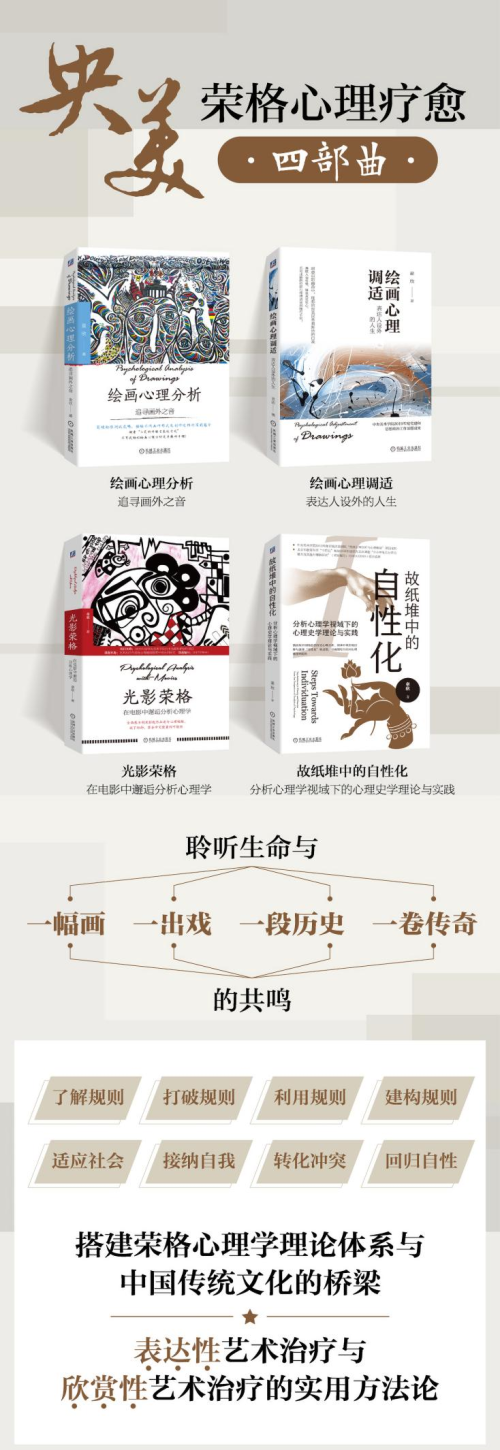 从横向的学科领域来看,前两本《绘画心理分析》和《绘画心理调适》是将分析心理学与绘画艺术相结合,是基于“表达性艺术治疗”的理论与实践研究成果;《光影荣格》则是将分析心理学与电影艺术相结合,从“欣赏性艺术治疗”的角度来挖掘分析心理学的独特价值;《故纸堆中的自性化》则是将荣格的理论和中国传统文化更紧密地链接,从中国哲学、历史和文学的角度,为个体和集体的自性化之路提供独特视角。