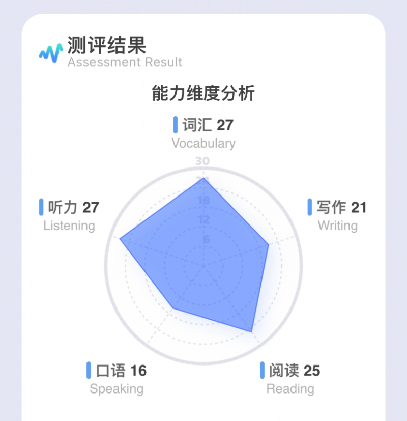 用户可以在叫叫App随时参与线上测评,测评时长5-8分钟,测后即可实时形成测评报告。报告采用量化、图表化的展现形式,量化得分对标GSE、新课标及欧标三大体系,在培养国际化综合语言运用能力的基础上,满足英语学科核心素养培养的基本要求,精准定位中国儿童英语能力等级。图表则从词汇、口语、听力、阅读、语法五大维度清晰呈现儿童该项能力水平,做到优势与薄弱点一目了然。基于测评结果,报告还会给出对应的英语学习建议,提供薄弱项专属提升方案,帮助儿童制定更具针对性的学习计划,精准提升英语能力。