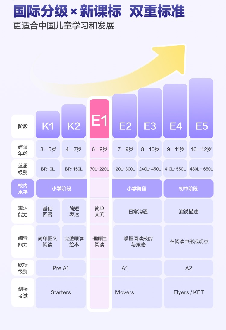 叫叫英语E1产品不仅对接CEFR(欧洲共同语言参考标准)和GSE(全球英语水平测试标准) ,同时符合国内新课标学生的英语能力要求,是一套真正覆盖国内外英语学习标准并兼具国际视野的英语学习产品。