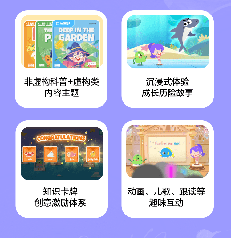 除引进国际优质内容资源外,叫叫英语E1产品,实现内容主题、知识点、能力要求贴合国内新课标。内容选题包含“人与自我” “人与社会” “人与自然”,密切贴合小学阶段的学习要求和社会生活经验,知识点涵盖语言知识重难点、易错点等,帮助孩子实现听、读、看、说、写能力的全面提升。