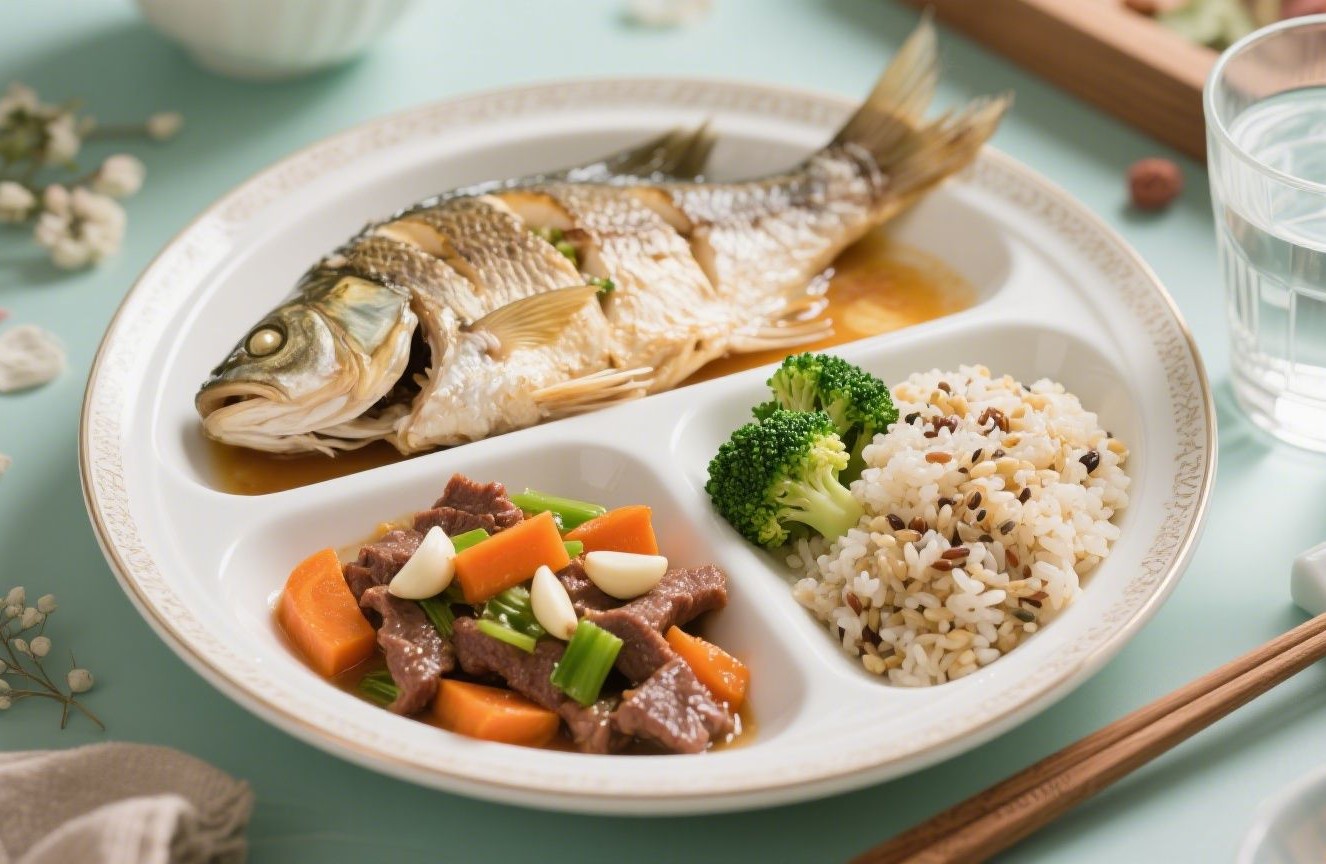 午餐需注重蛋白质与膳食纤维的平衡,清蒸鲈鱼、胡萝卜炒牛肉、蒜蓉西兰花配杂粮饭是经典选择,既能提供 DHA 增强脑细胞传导,又富含维生素 B 族稳定神经系统。