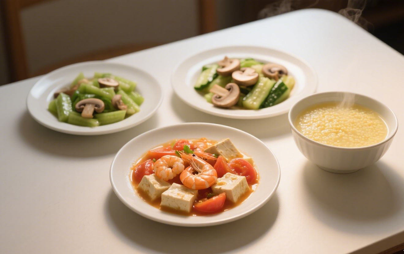 晚餐宜清淡易消化,如西红柿虾仁炖豆腐、丝瓜炒口蘑,搭配小米粥,避免油腻影响睡眠。