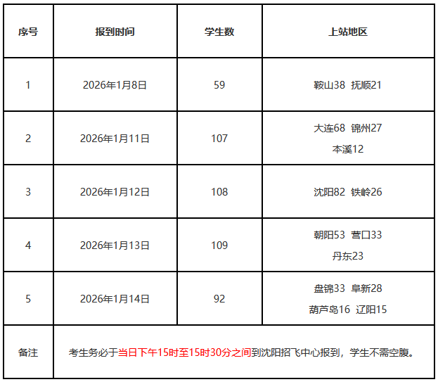 1.按时报到。参加此次复选的考生,严格按照名单标注的报到日期报到,考生安排好行程,注意途中安全,各地市可视情安排1-2名带队人员(如有,请提前与沈阳招飞中心联系上报)。