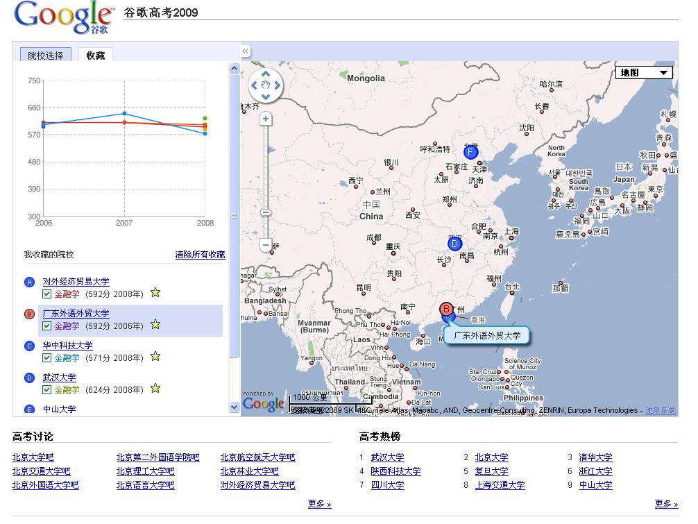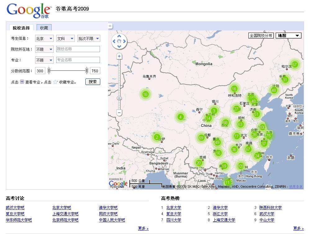 每个人的生命中,大学的岁月只有一次,把握你的青春和命运,我们衷心的希望。“谷歌高考2009”地图能够给你最好的帮助。