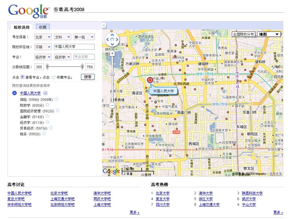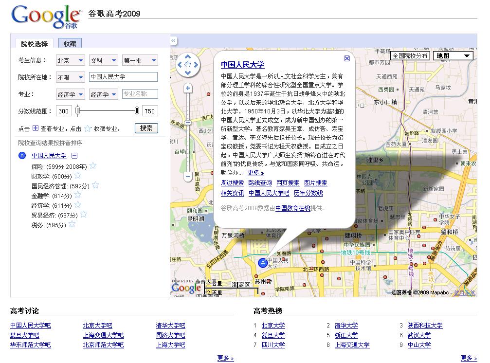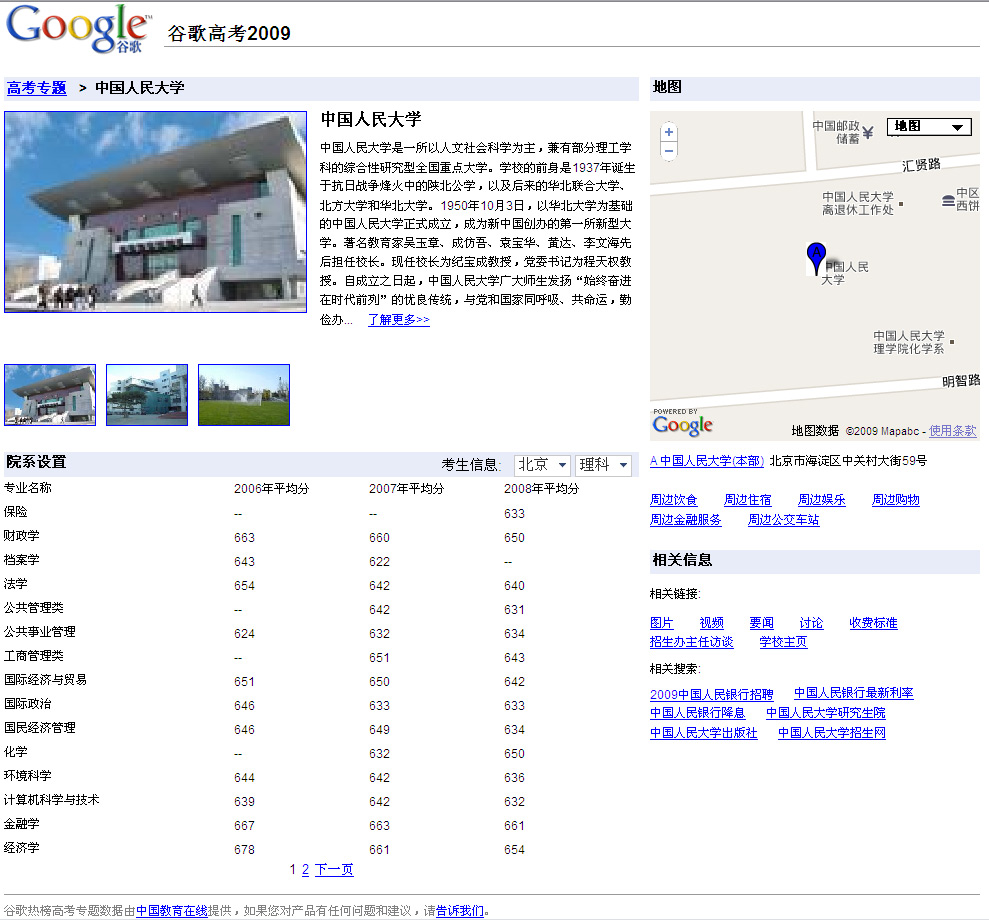 学校的历史和地缘往往决定了分数的高低。“谷歌高考2009”地图还提供了高校的分数线查询功能,如果你希望报考人民大学,点击人民大学旁边的小泡泡,不仅可以看到人民大学的简介,了解人民大学周边的基本情况,也能查询到历年人民大学今年的录取分数线,以及过往几年的历史分数线。