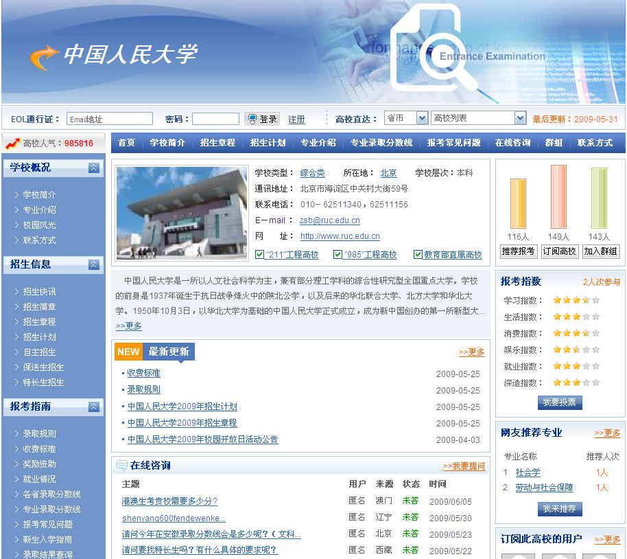 点击学校简介下的“了解更多>>”进入中国教育在线中国人民大学的2009年高考招生信息发布页面,你可以查询学校2009年招生简章、招生计划、开设专业及介绍、录取规则、奖励资助政策、近4年人民大学在各省的录取分数线,网友对人民大学的评价可以作为你填报志愿的参考。