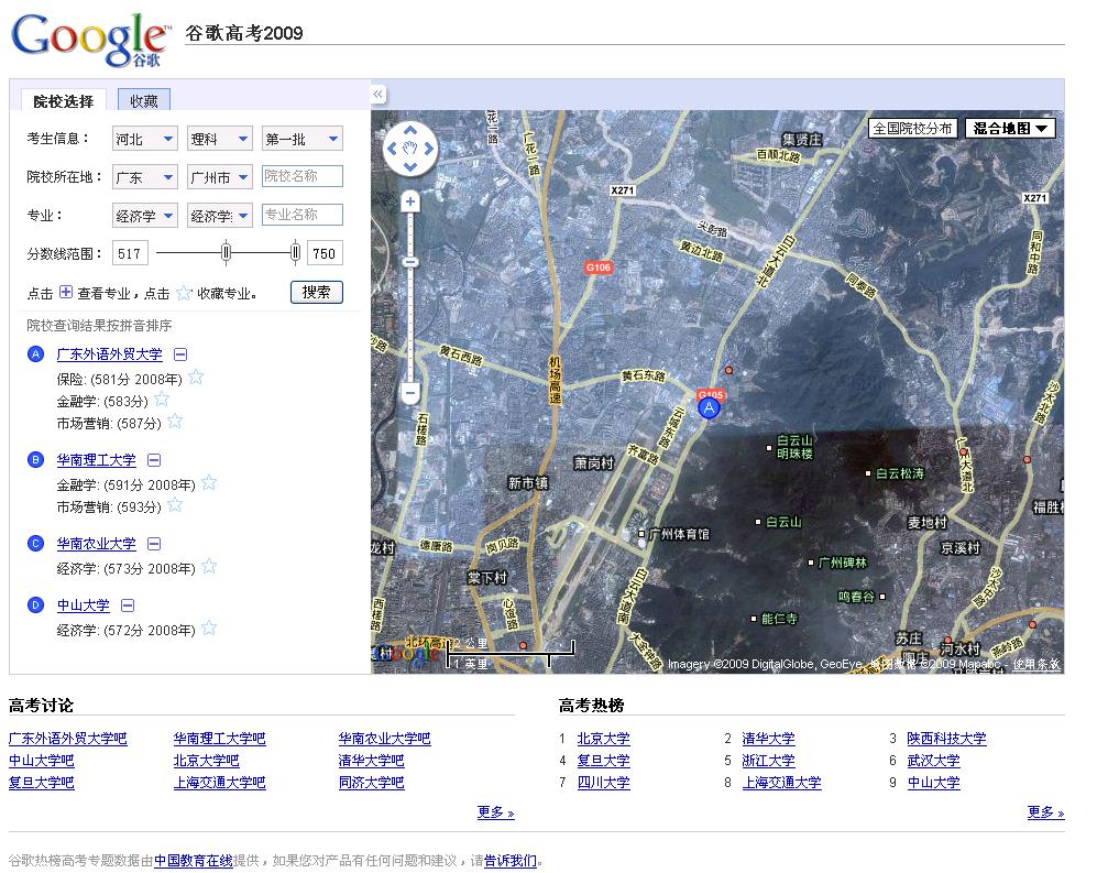 十年寒窗,一朝高考,全国上千所大学,如何筛选?谷歌联合中国专业教育网站中国教育在线推出的谷歌高考2009地图帮你填报高考志愿。“谷歌高考2009”地图的所有数据来自于中国教育在线,可以提供全国31个省上千所大学的信息。