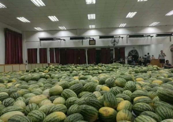 上千平方米的舞蹈房里堆了一地,很是壮观。舞蹈房里有空调,也有风扇,西瓜不容易坏。