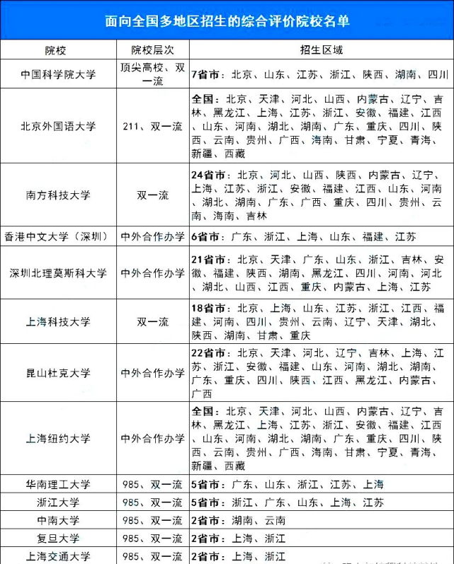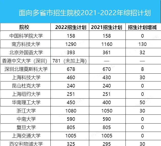 2022年,面向多省市综合评价招生院校共有14所,招生计划超过8500人,招生人数整体上涨。其中,南方科技大学扩招130人,华南理工大学扩招50人,浙江大学扩招30人,北外扩招32人..