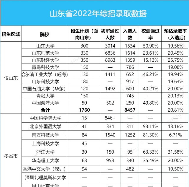 2022年面向山东省综合评价招生的院校共计19所,其中山东省内9所,面向多省市招生院校10所。2022年山东省内综评院校拟通过综合评价招生1760人,入选人数8691人,预估录取率20.25%,各校录取率在19.56%-25.75%之间。面向多省市招生的高校中,部分高校数据不全,预估录取率在6.71%-31.58%。