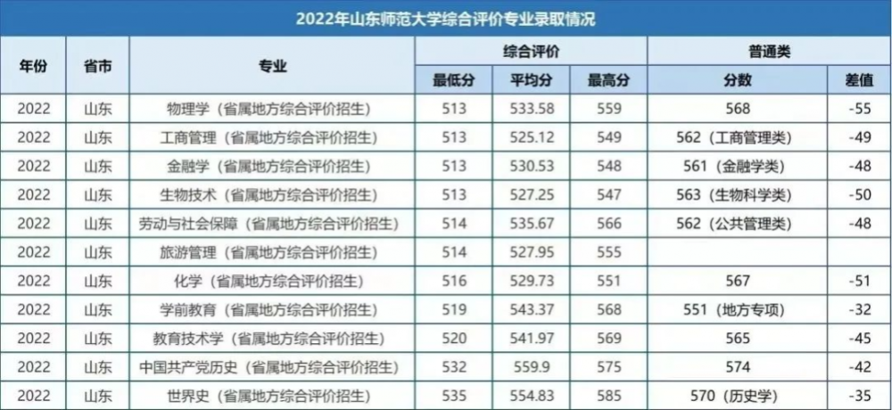 2022年山东师范大学综合评价共招收13个专业,其中最难考的专业是汉语言文学。值得注意的是有四门专业卡在了资格线上,分别是物理学、工商管理、金融学和生物技术。所以报考的考生分数需要达到22年的特招线,也就是513分才能报考山东师范大学的综评专业。