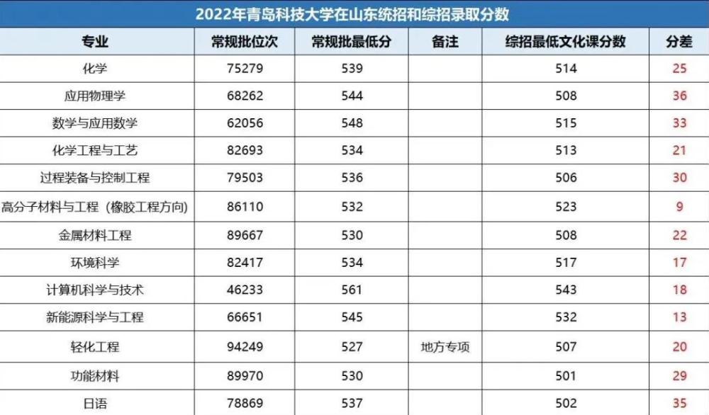 青岛科技大学22年综评招收专业数与21年持平,都是15个专业,每个专业分别招收10人,通过上面表格的数据其实大家可以看出热门专业的报考人数很多。相比于文化课对比来看,应用物理学和日语这两个专业降分幅度是属于最为明显的,相比于文化课的544,综招录取最低分508,应用物理学的综招专业属于降36分被录取,36分相当于位次提高了6万到6.5万位次,这样回想一下,综招走成功确实很吃香。