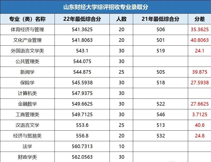 山东财经大学22年综评招收14个专业,相比去年招收专业有所变化,今年新增了法学、计算机类、财政学类这三个专业,去年管理科学与工程专业取消,而加了公共管理类专业。今年招收专业录取分数全面上涨,多个专业分数上涨高达30-40分。这也提醒各位,想要通过综合评价升学的考生,必须提前做准备,综评每年报考火热,竞争激烈,早准备打算就增加一丝成功的可能。