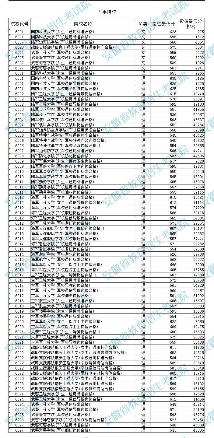 陆军工程大学在安徽理科最低录取分数为女生615分(通信导航岗位合格)、578分(军校通用标准合格)、592分(军校通信导航岗位合格);