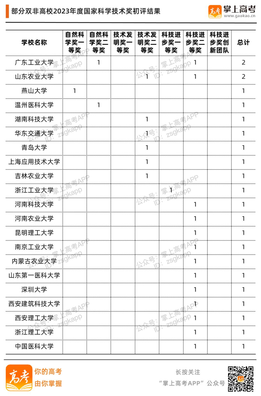 2023年度国家科学技术奖的初评结果,在非“双一流”高校中,广东工业大学和山东农业大学有2个项目通过了自然科学奖的初评,其余高校则均有1个项目通过初评。