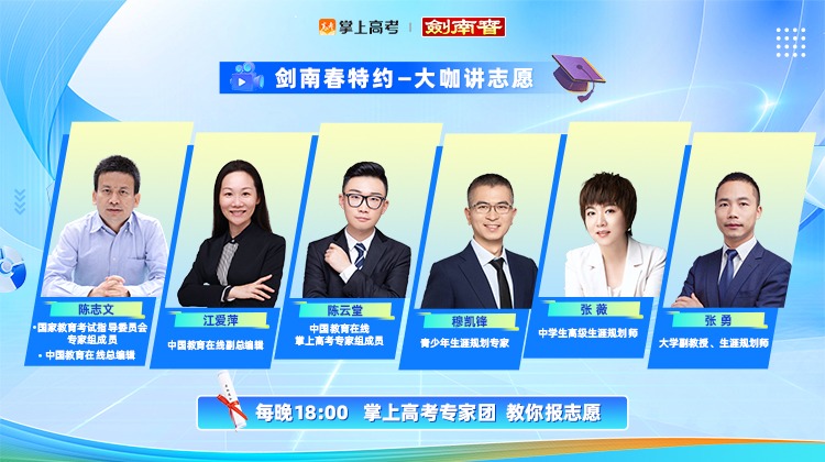 为助力考生进行科学填报,帮助广大考生了解志愿填报模式,6月11日-6月23日,中国教育在线·掌上高考联合剑南春特别推出“大咖讲志愿——2025志愿填报系列公益直播”活动,为各位考生和家长分享志愿填报相关干货,为大家答疑解惑。