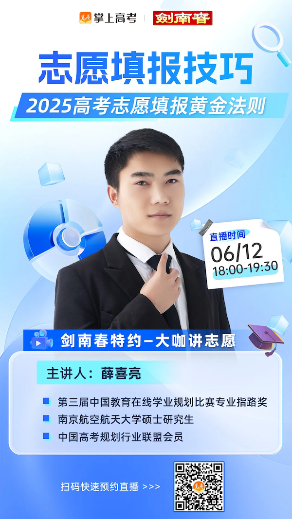 别让犹豫与迷茫耽误前程!为助力考生进行科学填报,帮助广大考生了解志愿填报模式,6月11日-6月23日,中国教育在线·掌上高考联合剑南春特别推出“大咖讲志愿——2025志愿填报系列公益直播”活动,为各位考生和家长分享志愿填报相关干货,为大家答疑解惑。