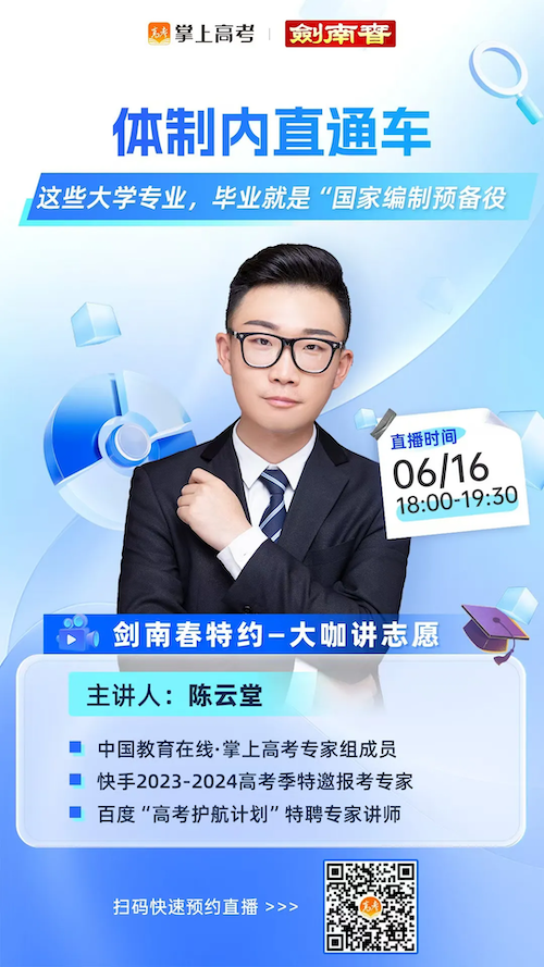 6月16日18:00,中国教育在线·掌上高考智库专家组成员、快手2023-2024高考季特邀报考专家、百度“高考护航计划”特聘专家讲师陈云堂老师,将以“体制内直通车:这些大学专业,毕业就是‘国家编制预备役’”为主题,为大家带来考公相关专业的精彩分享,一起来看看都有哪些重点吧!