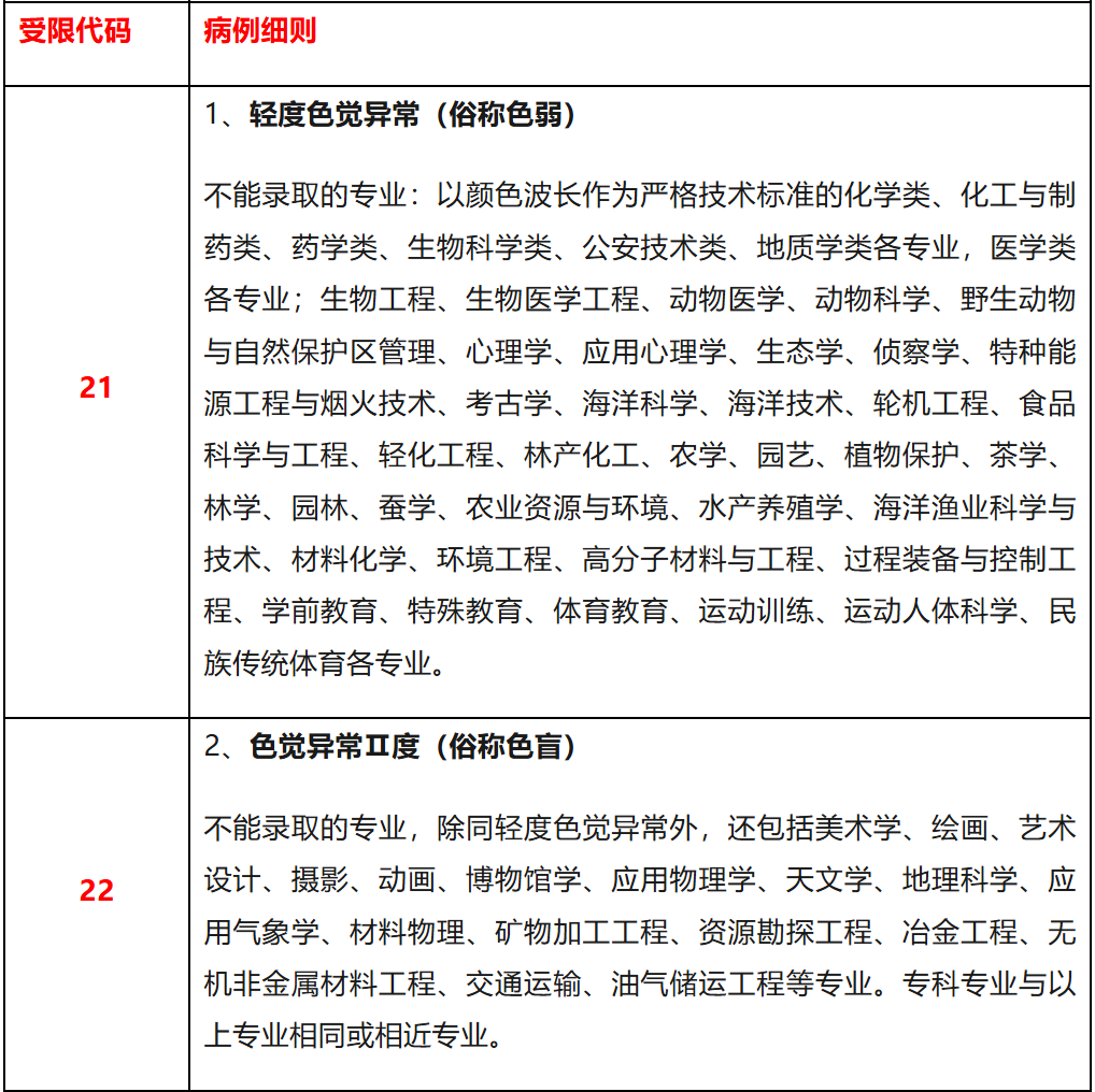2.代码21-26:对应“相关专业可不予录取”的情况,常见于色觉异常、视力不足等,具体受限专业如下: