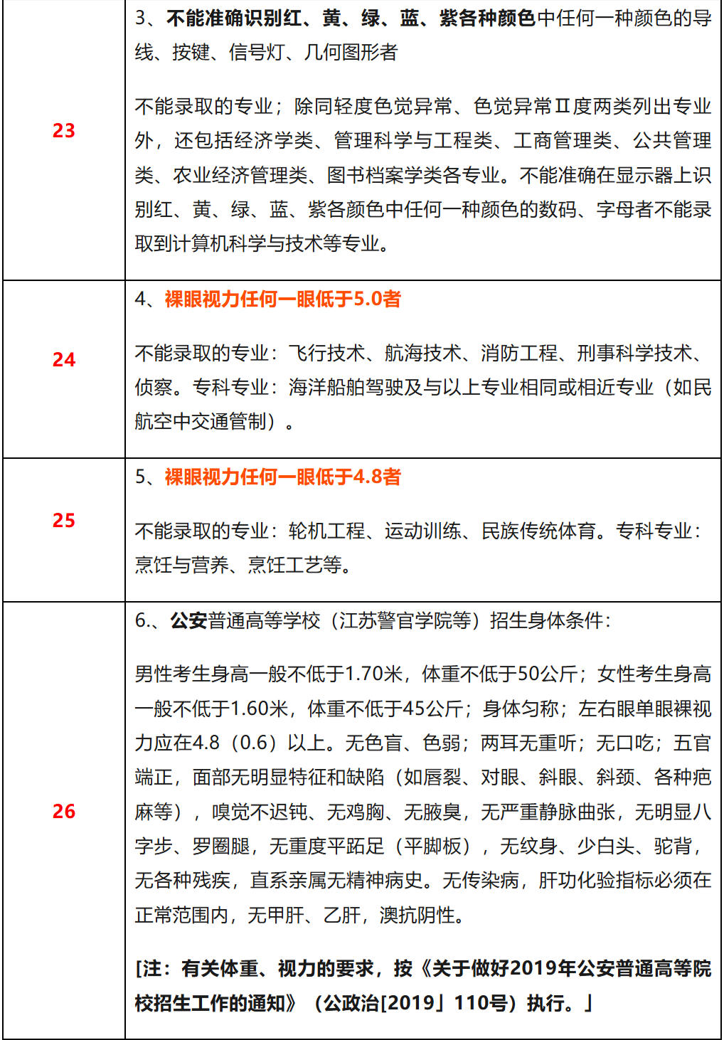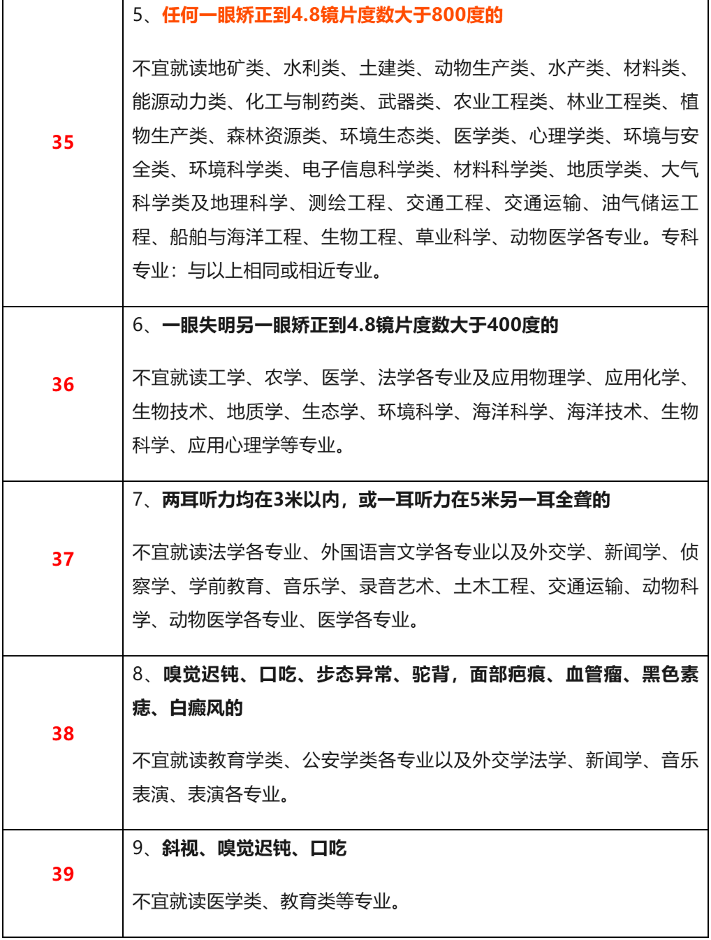 -视力不足:裸眼视力任何一眼低于5.0,不能报考飞行技术、航海技术、消防工程、刑事科学技术等专业;低于4.8的,不能报考轮机工程、运动训练、民族传统体育等专业。