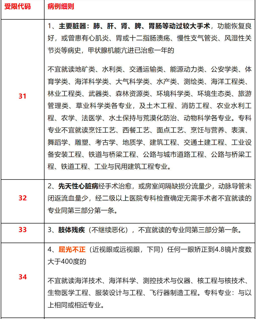 若手术恢复良好,需参考限报代码31-39的要求,避开不宜就读的专业,具体可对照本文第五部分内容。