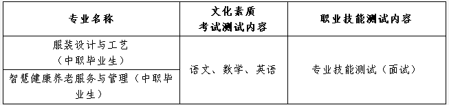 第十四条 此次高职单招招生考试采取“文化素质+职业技能测试”的模式,考试时间为4月6日(其中文化素质测试时间为9:00—11:30,职业技能测试时间为14:00—17:00)。各专业考试方式具体见下表。