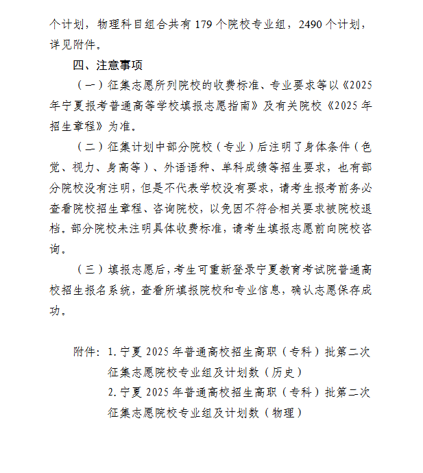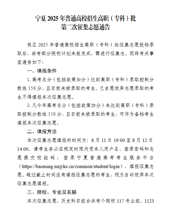 宁夏2025年普通高校招生高职(专科)批第二次征集志愿通告